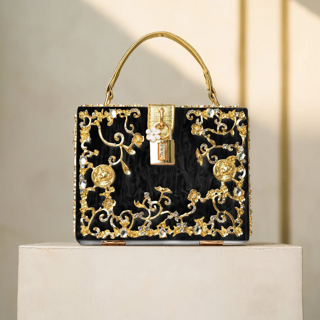 Discover the modern elegance of the Acrylic Box Handbag. This handbag redefines luxury with its box-shaped silhouette and gold-plated floral embellishments. Its sleek design and secure turn-up lock add a touch of sophistication. Perfect for a contemporary outfit, this vegan & cruelty-free handbag is a structural marvel that effortlessly blends style and function.