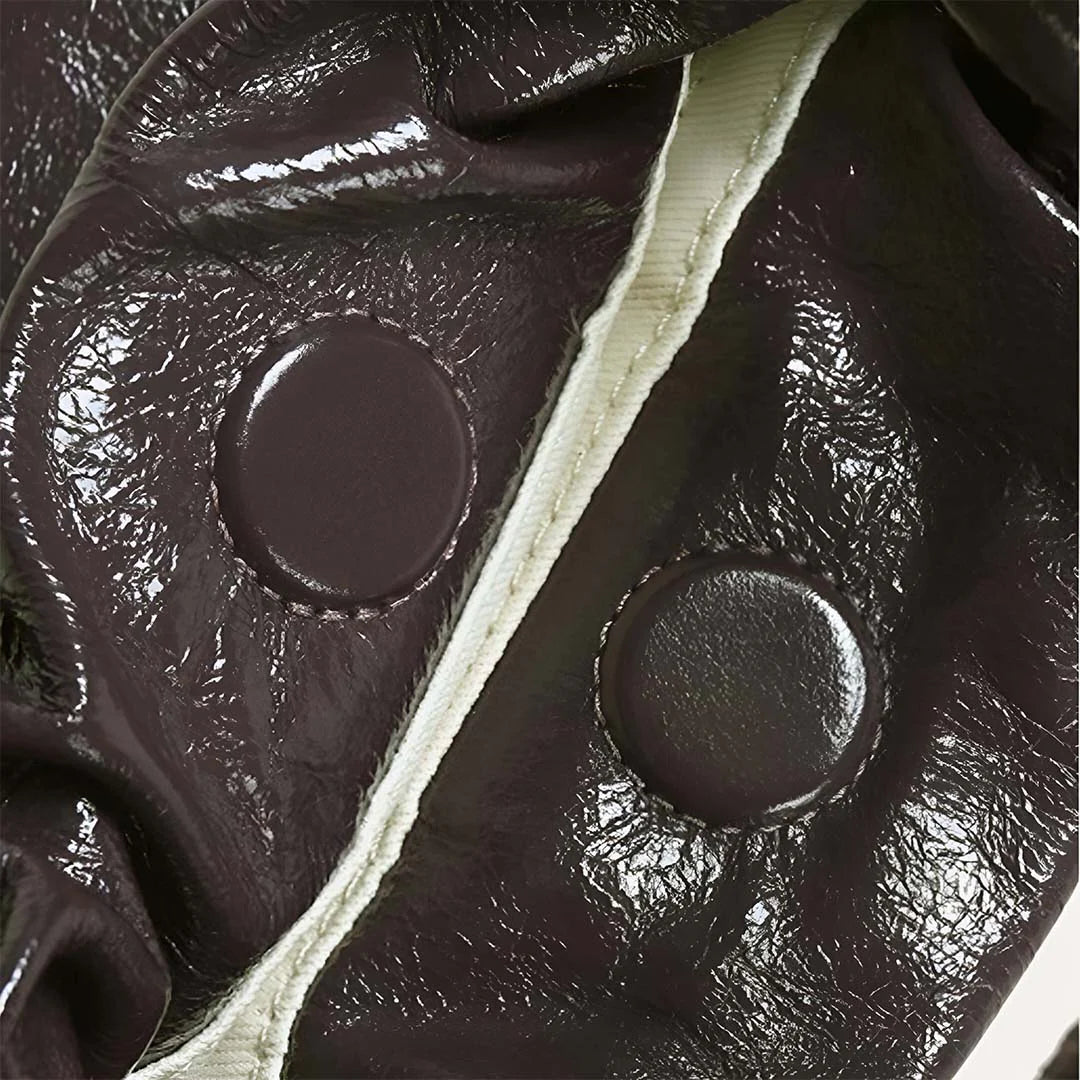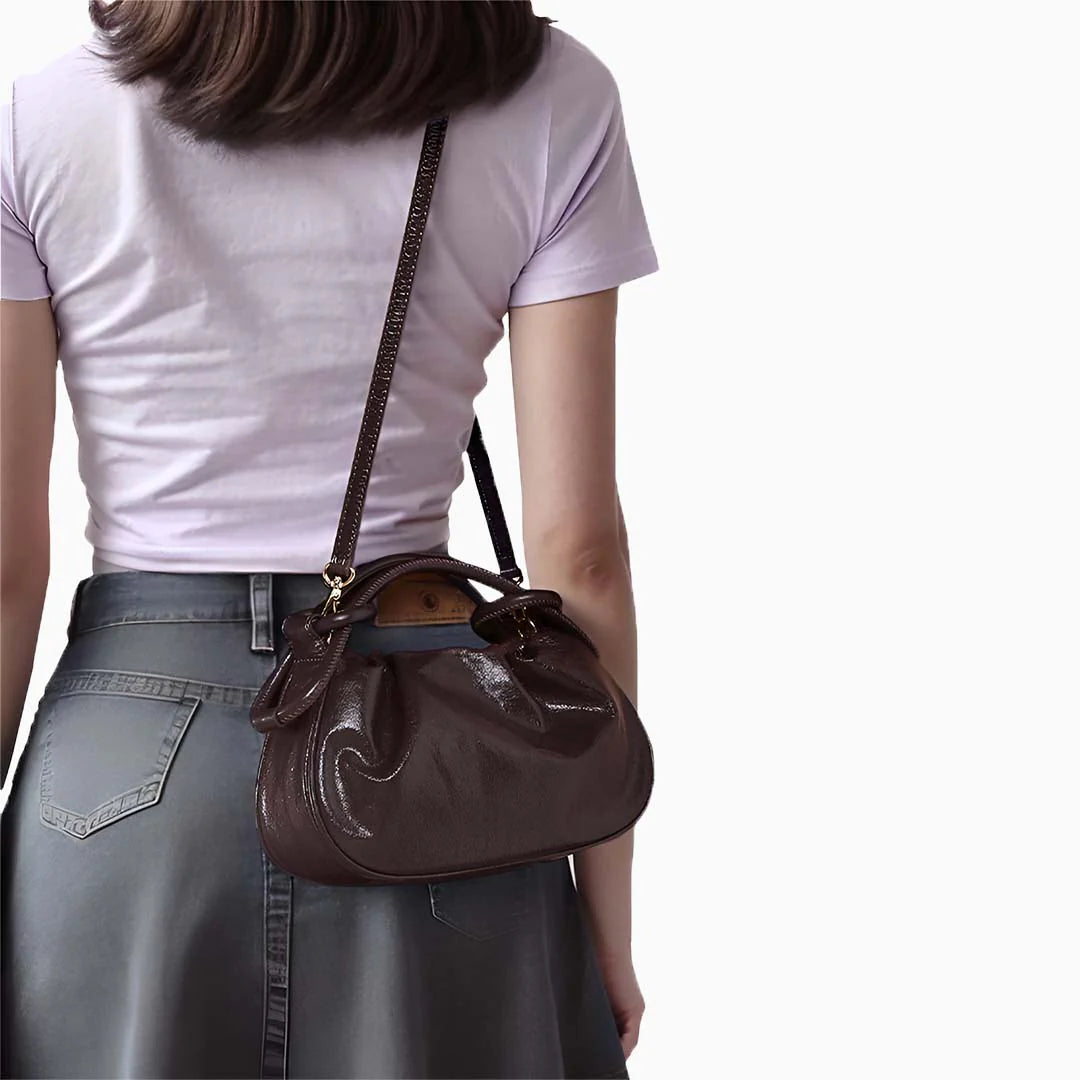 Crafted from high-shine genuine leather, Alexis catches the light with its softly gathered silhouette and polished finish. The scrunched top adds a relaxed yet refined edge, while the knotted loop-through handles give it an elevated sculptural feel that sets it apart from the everyday. A discreet magnetic clasp keeps your essentials secure, and the spacious interior is ready for everything from quick errands to last-minute plans. It features a detachable strap that easily converts it from a chic handheld to a hands-free crossbody. Exclusively available in coffee.