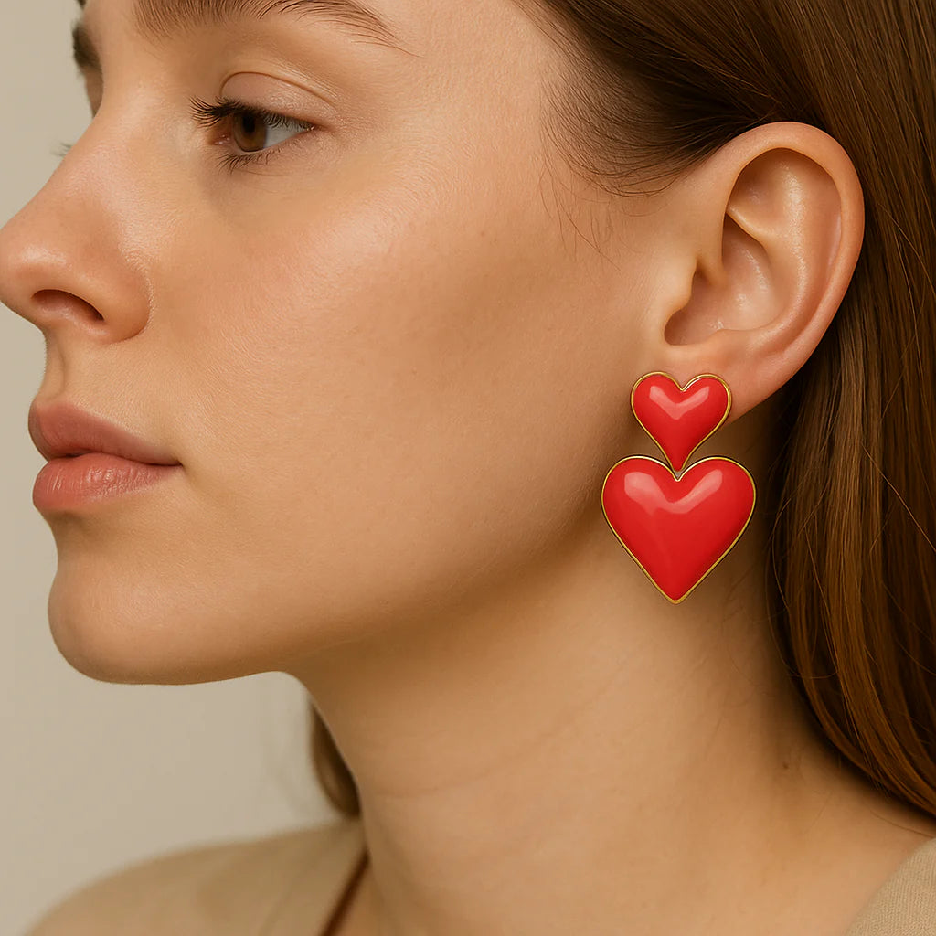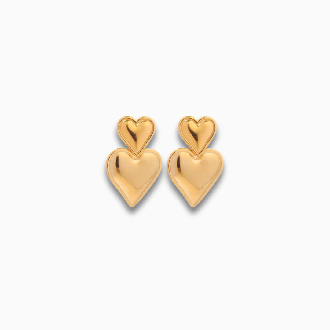 The Amara Double Heart Earrings channel vintage glamour with a bold, romantic twist. Designed in a sculptural silhouette of stacked hearts, their mirror-like shine captures the light beautifully from every angle. Crafted from high-quality stainless steel, they offer a sleek finish that’s as durable as it is eye-catching. The polished curves bring softness to their statement-making form, blending elegance with a playful edge. Whether worn to elevate your everyday look or add charm to an evening ensemble, they make a striking impression with ease.