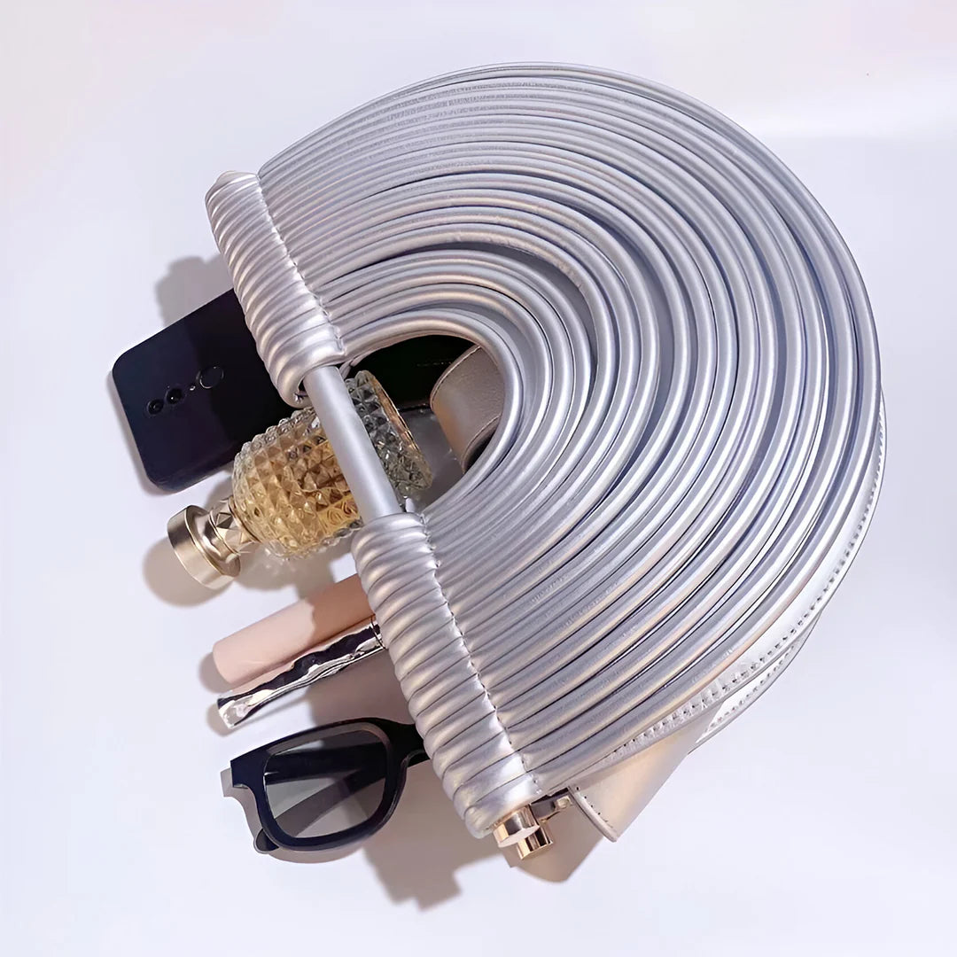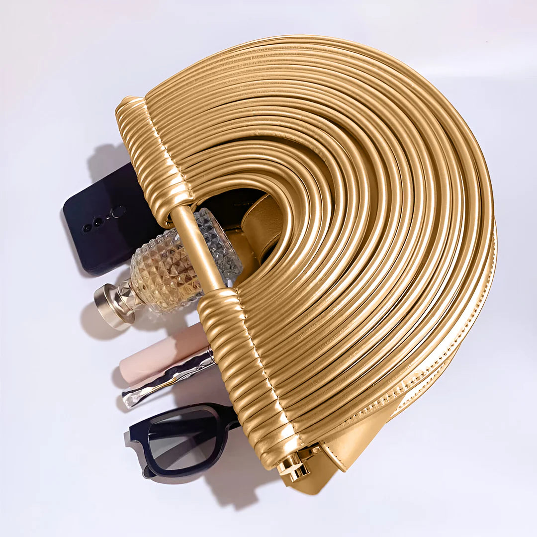 Elevate your elegance with the Amara Handbag – a statement piece that blends bold design with refined craftsmanship. Featuring a distinctive semi-circle silhouette and luxe metallic finish, this bag is perfect for both day and evening wear. Complete with a detachable strap and structured handle, it offers versatility and style in one iconic accessory.
