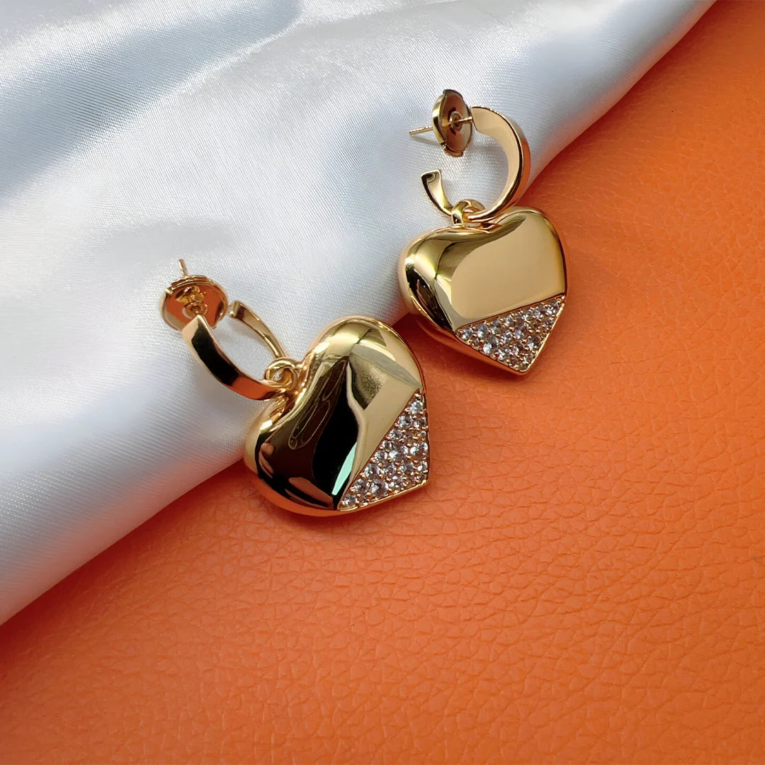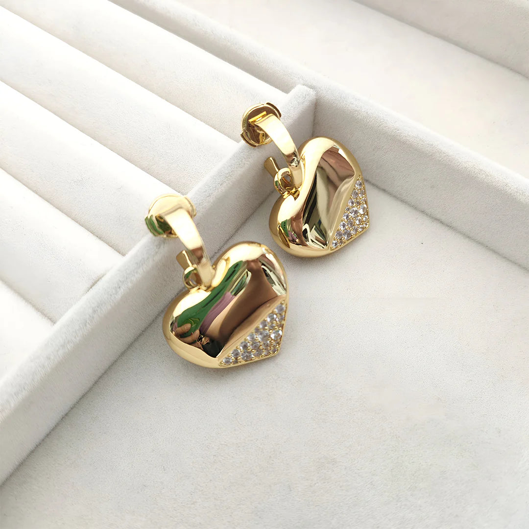 Aurea Heart Drops blend playful romance with contemporary edge, capturing attention with their glossy heart silhouette and shimmering pavé detail. The bold, golden curves contrast beautifully with a triangle of hand-set crystals, giving these earrings an alluring asymmetry that feels both luxe and modern. Perfect for elevating your day-to-night style, they add a touch of warmth and sparkle to any look. Whether paired with a slip dress or structured blazer, they exude effortless glamour.