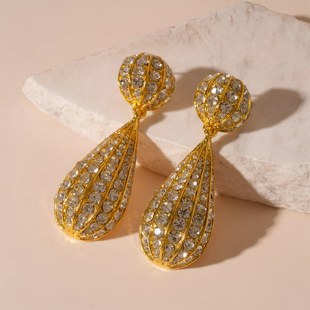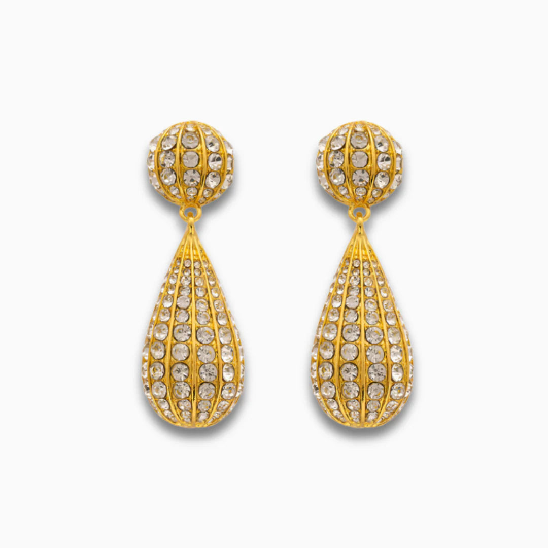 A celebration of old-world glamour and contemporary allure, the Aurelia Cascade Drop Earrings dazzle with every movement. The elongated teardrop silhouette, framed in golden arches and encrusted with radiant crystals, creates a dramatic play of light that instantly elevates your evening ensemble. Designed to captivate from gala nights to candlelit dinners, these earrings exude opulence without overpowering. Their sculptural drop design offers both dimension and drama, while maintaining a graceful elegance.