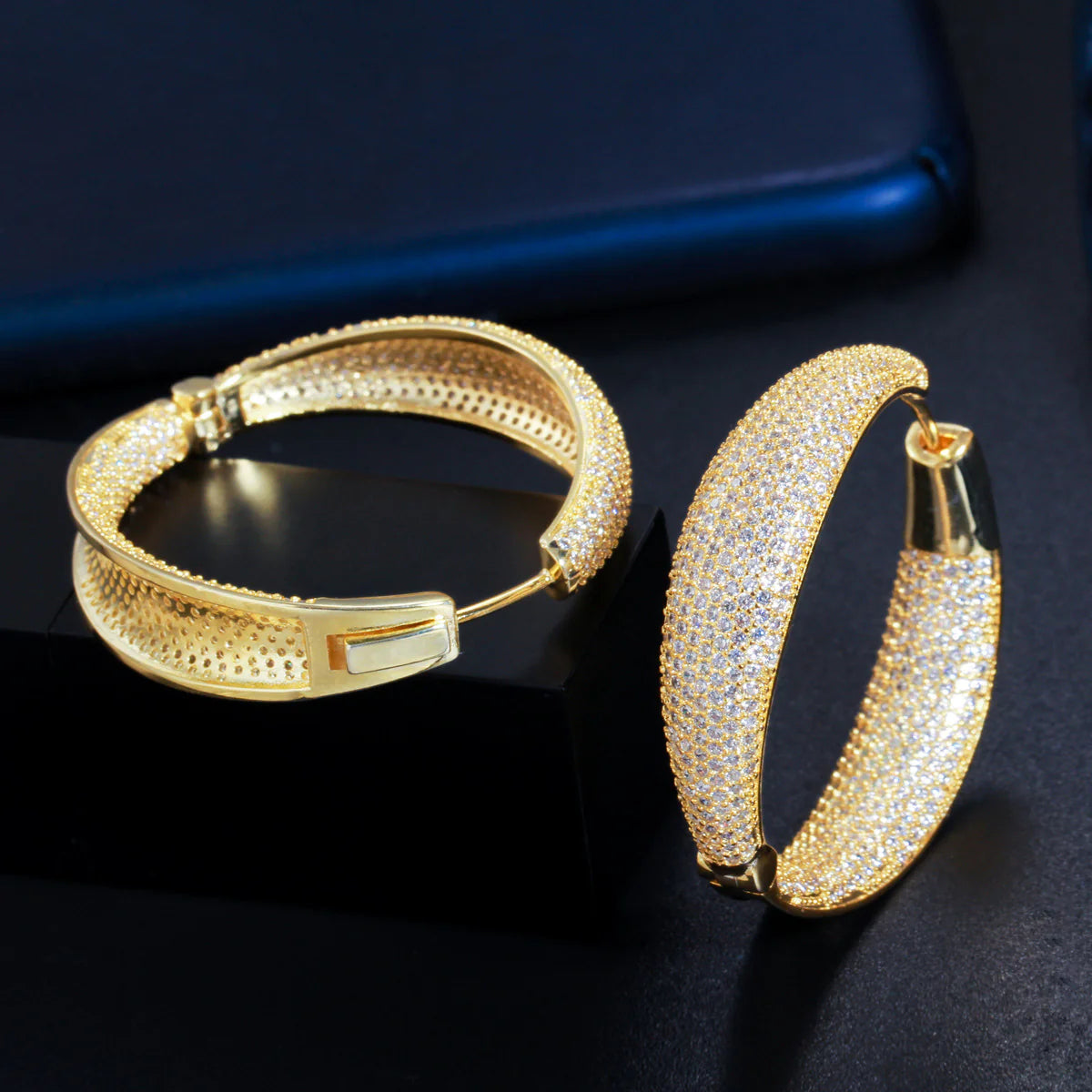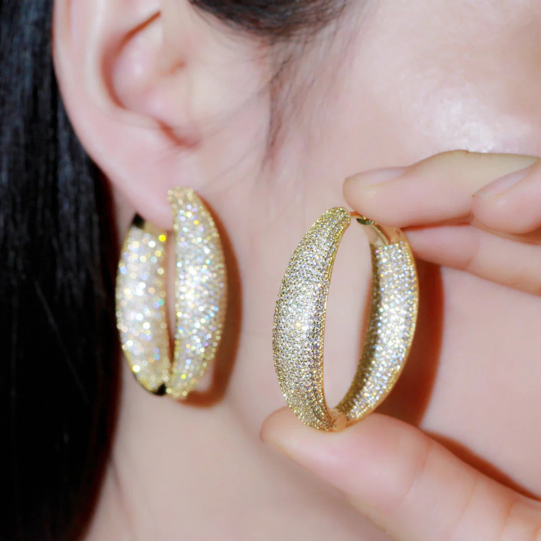 The Auristra Grande Earrings channel bold luxury through their sweeping curves and endless shimmer. Lavishly encrusted with dazzling micro-pavé stones, these sculptural hoops glisten with every tilt and turn, catching light like golden constellations. Their wide, domed silhouette adds striking presence, making them the ultimate power piece for festive evenings or standout daywear.