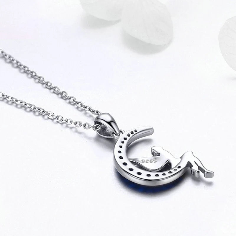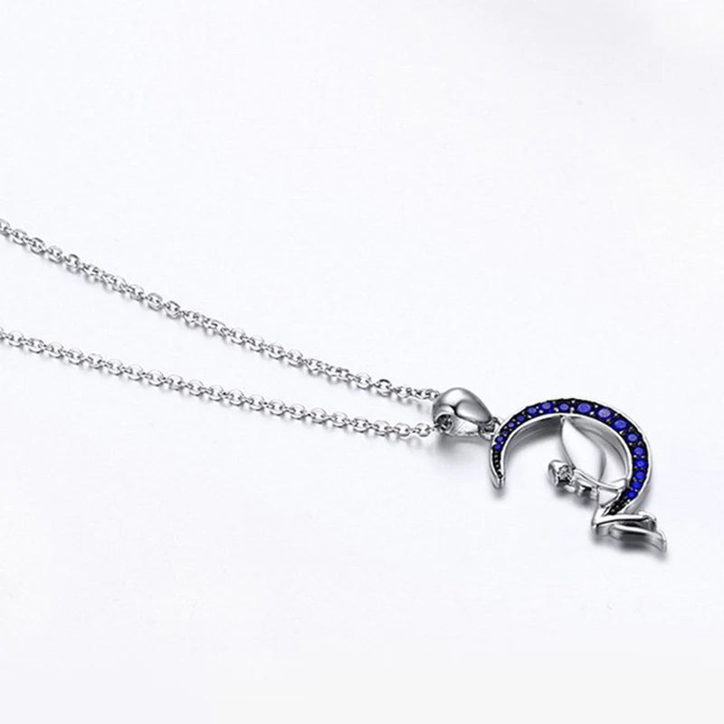 Beautify your neckline with the enchanting Blue Moon Fairy Necklace. This amazing necklace is crafted with 925 Sterling Silver & features a fairy sitting on a moon adorned with blue CZ diamonds. Exclusively available in silver.