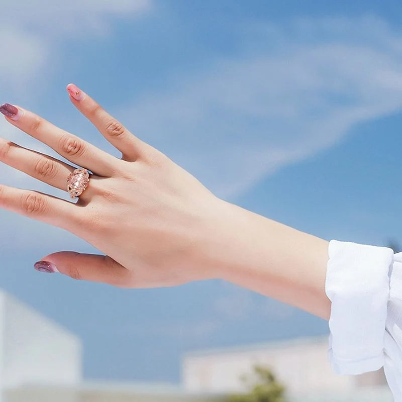The Blushing Rose Ring is a timeless classic. It features a pink stone that has a soft rose hue & is accented on the sides with petal-like detail embellished with glittering cz diamonds. This 925 Sterling silver ring is exclusively available in rose gold & is a great addition to your everyday ensemble.