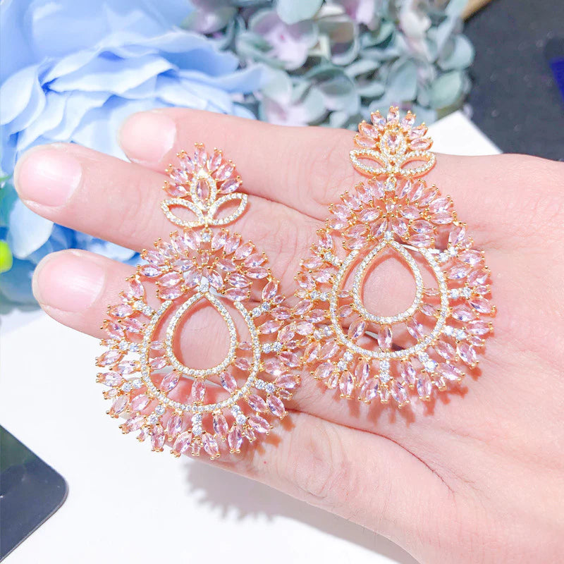 The Celistra Teardrop Earrings radiate graceful sophistication with an intricate lattice of soft peach marquise-cut stones surrounding a delicate teardrop silhouette. Flecked with glimmering accents and layered in gold-tone detailing, these earrings capture the essence of floral elegance and high glamour. A luminous statement piece perfect for celebratory evenings and festive attire.