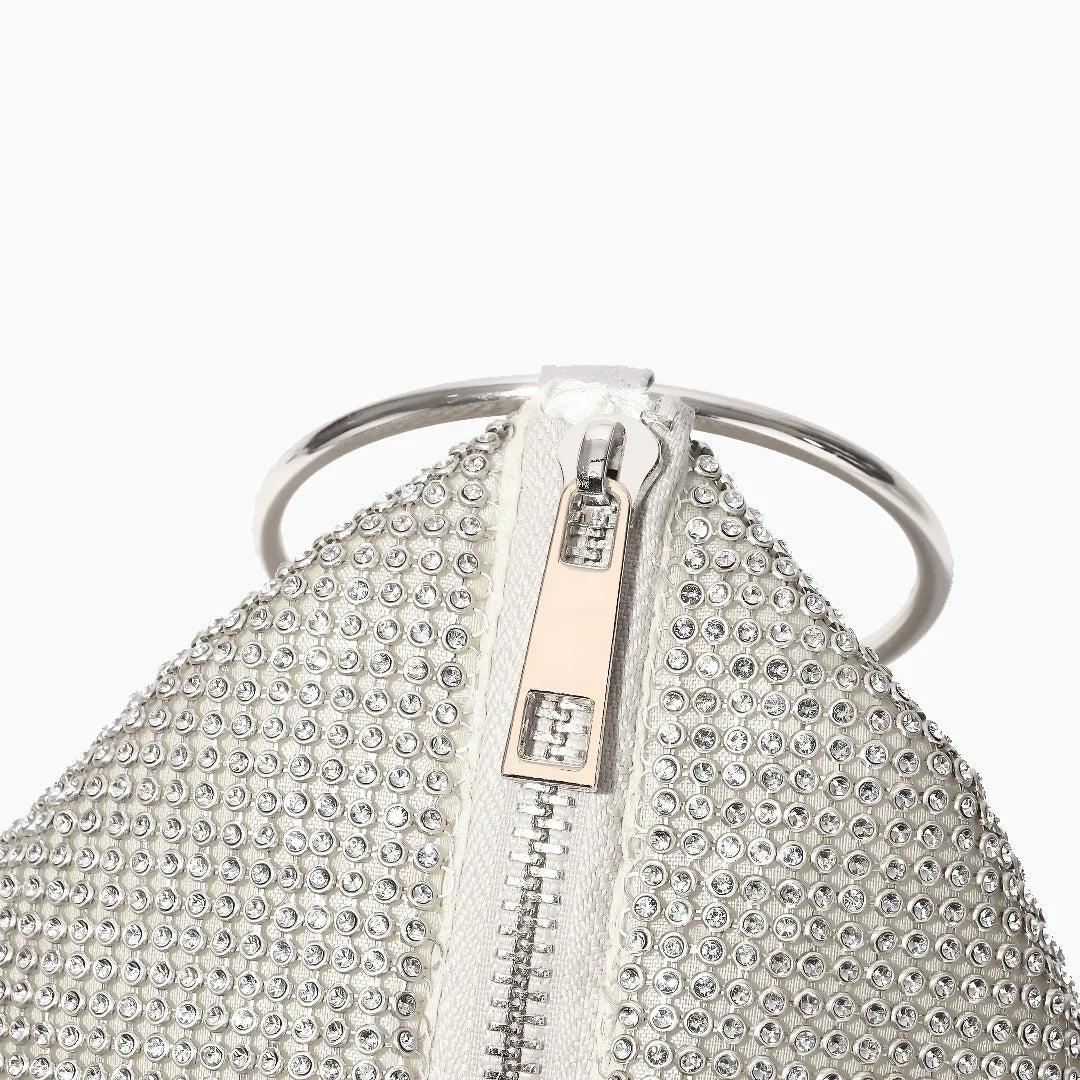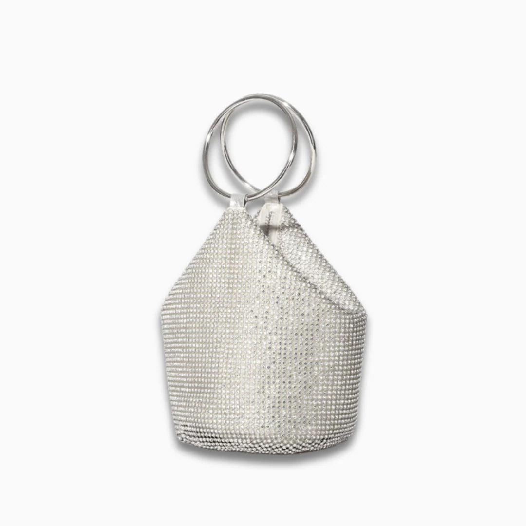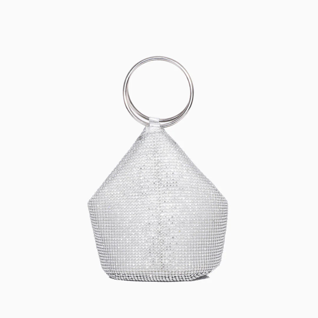 Turn heads and steal spotlights with the Colette Handbag — a dazzling twist on the classic basket bag. Featuring a unique triangular top and rounded bottom, its slouchy structure creates soft, artful folds that set it apart. The glossy metal ring handles, encrusted with rhinestones, add just the right dose of shine, making this bag an instant glamour piece. A subtle zipper closure keeps your essentials secure, while the spacious interior lets you carry more than just the bare minimum. Now available in black, gold, and silver.