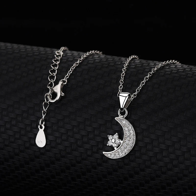 This Crescent Moon And Star Necklace is a shining beauty. It hangs from a sterling silver chain that passes through a beautifully crafted star on the moon pendant that is embellished with shining gemstones. Exclusively available in silver. You can wear the elegant pendant solo or double it up with other necklaces from your collection.