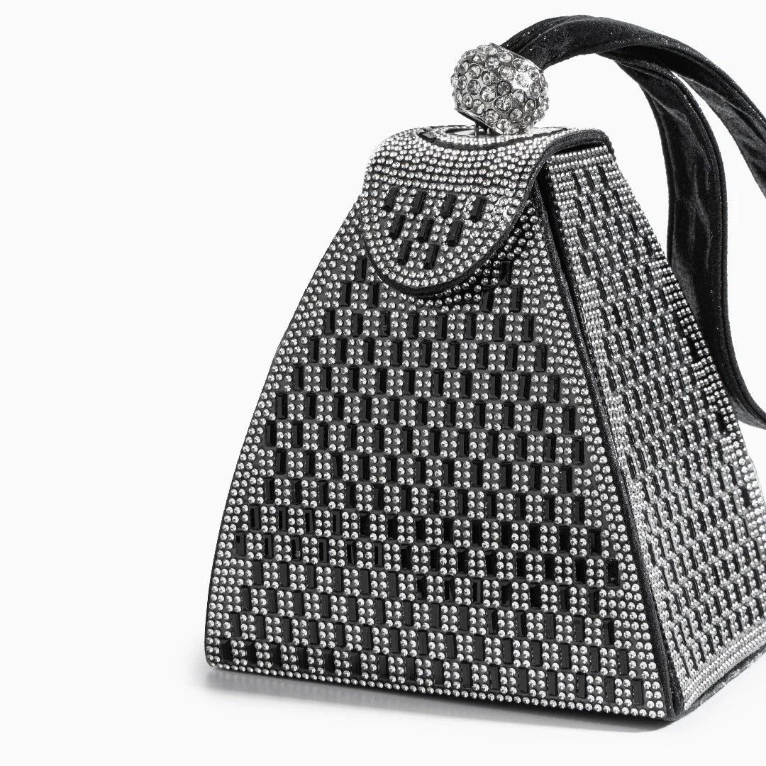 Elevate your style with the Crystal Pyramid Handbag. Crafted from premium vegan & cruelty-free leather, its unique pyramid-inspired design and magnetic closure combine fashion with functionality. The satin silk strap adds a touch of refinement, while the premium rhinestones bring an elegant flair. Available in black, silver, or gold, this handbag is an accessory that effortlessly complements any outfit. Choose sophistication with the Crystal Pyramid Handbag that redefines everyday elegance.