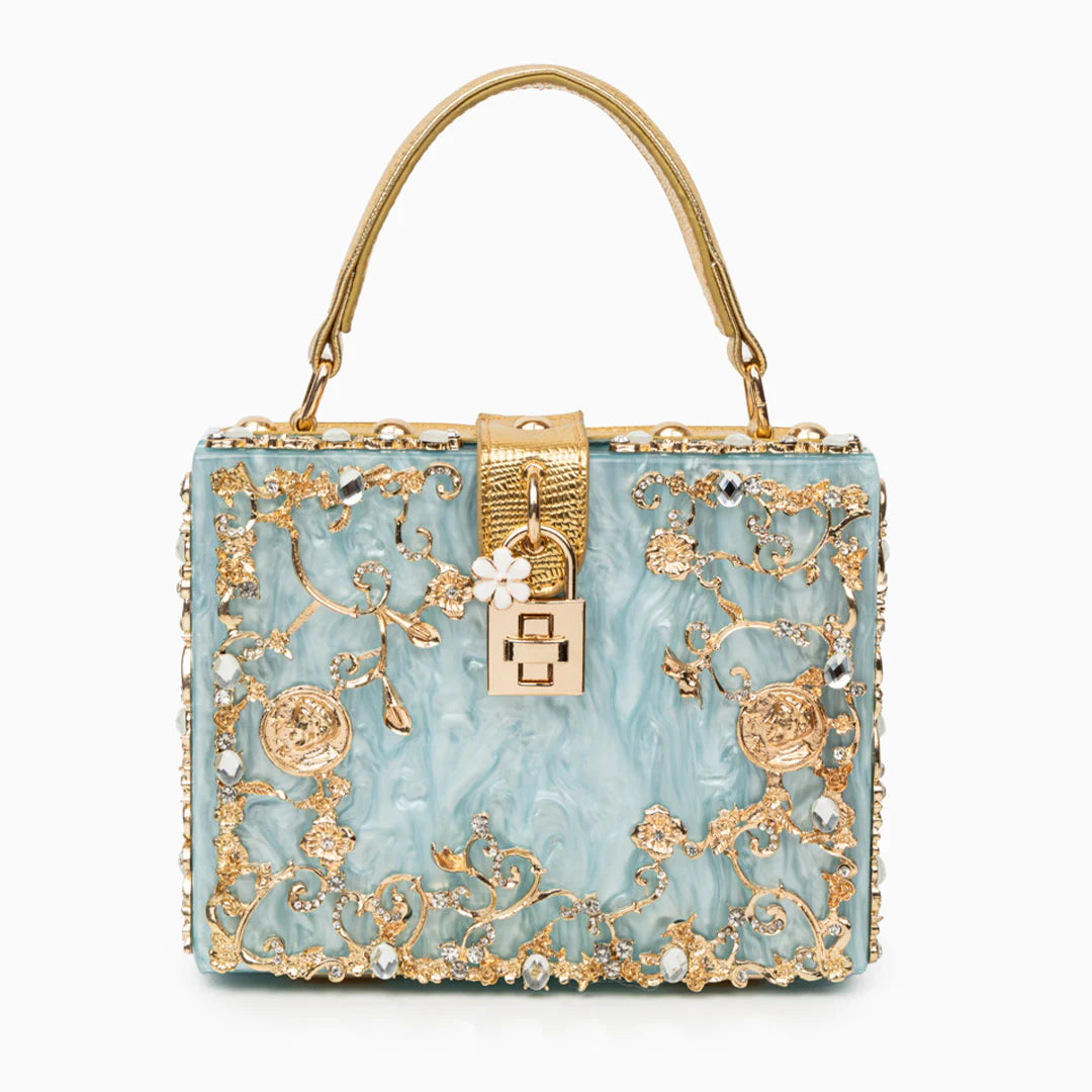 Discover the modern elegance of the Acrylic Box Handbag. This handbag redefines luxury with its box-shaped silhouette and gold-plated floral embellishments. Its sleek design and secure turn-up lock add a touch of sophistication. Perfect for a contemporary outfit, this vegan & cruelty-free handbag is a structural marvel that effortlessly blends style and function.