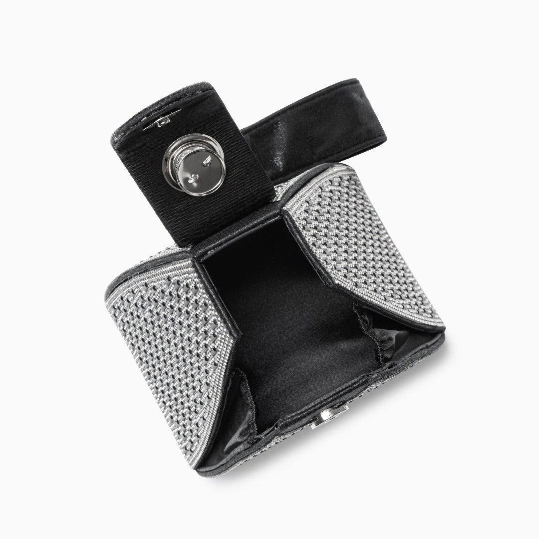 Elevate your style with the Crystal Pyramid Handbag. Crafted from premium vegan & cruelty-free leather, its unique pyramid-inspired design and magnetic closure combine fashion with functionality. The satin silk strap adds a touch of refinement, while the premium rhinestones bring an elegant flair. Available in black, silver, or gold, this handbag is an accessory that effortlessly complements any outfit. Choose sophistication with the Crystal Pyramid Handbag that redefines everyday elegance.