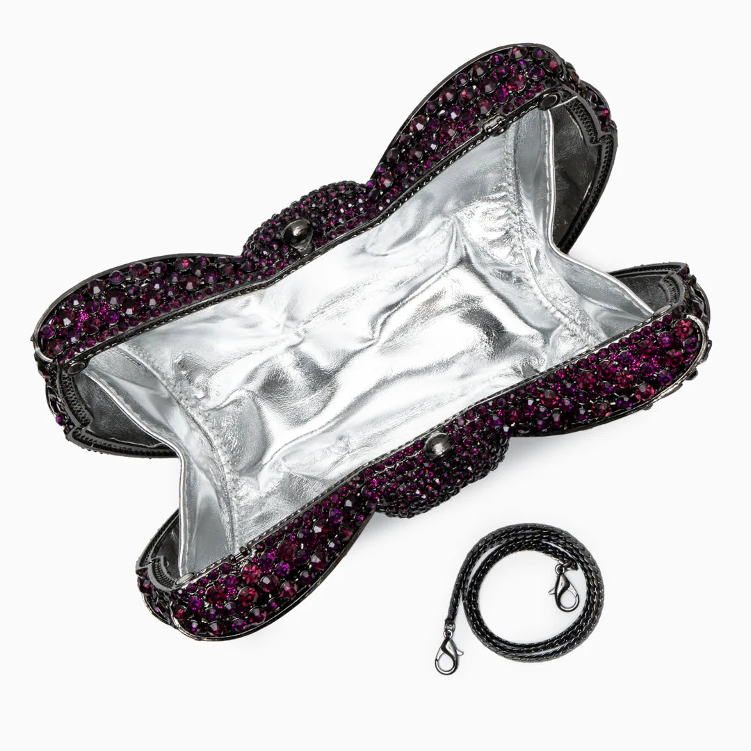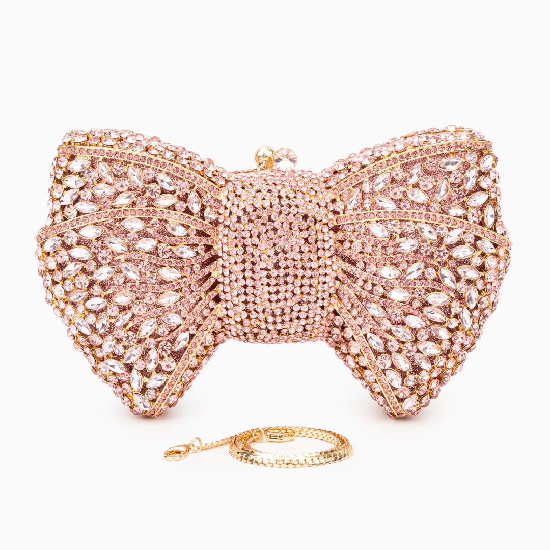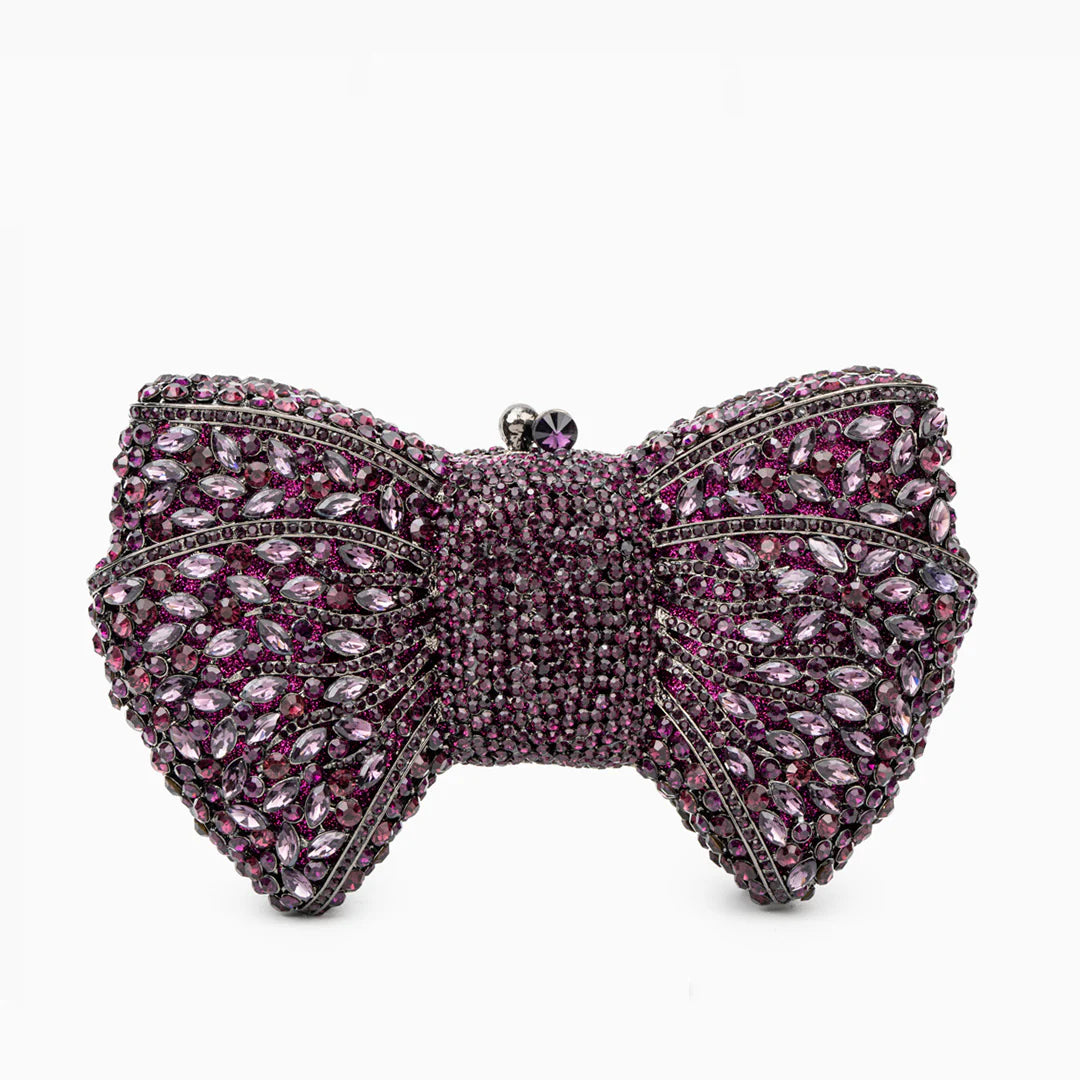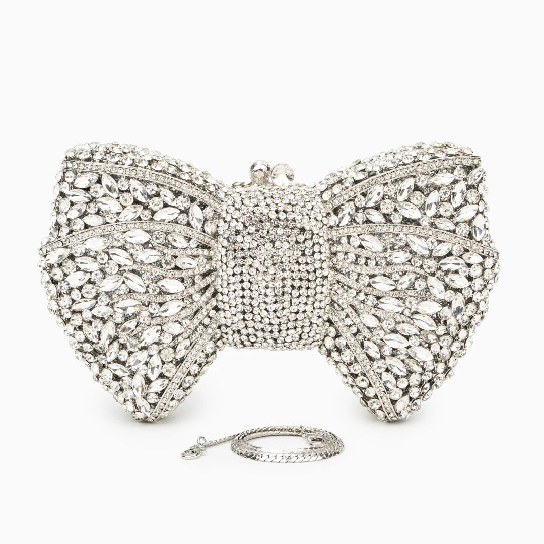 Step out in style with the Isabella Clutch Bag. This unique bag, adorned with rhinestones and a distinctive ribbon design, is a statement piece for any special occasion. Its glamorous and singular appearance is designed to complement your outfit, making you the center of attention. This vegan and cruelty-free clutch is perfect for red carpet moments.