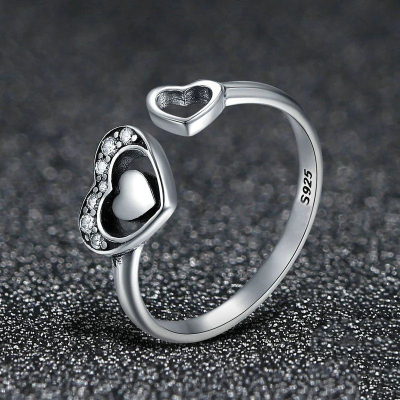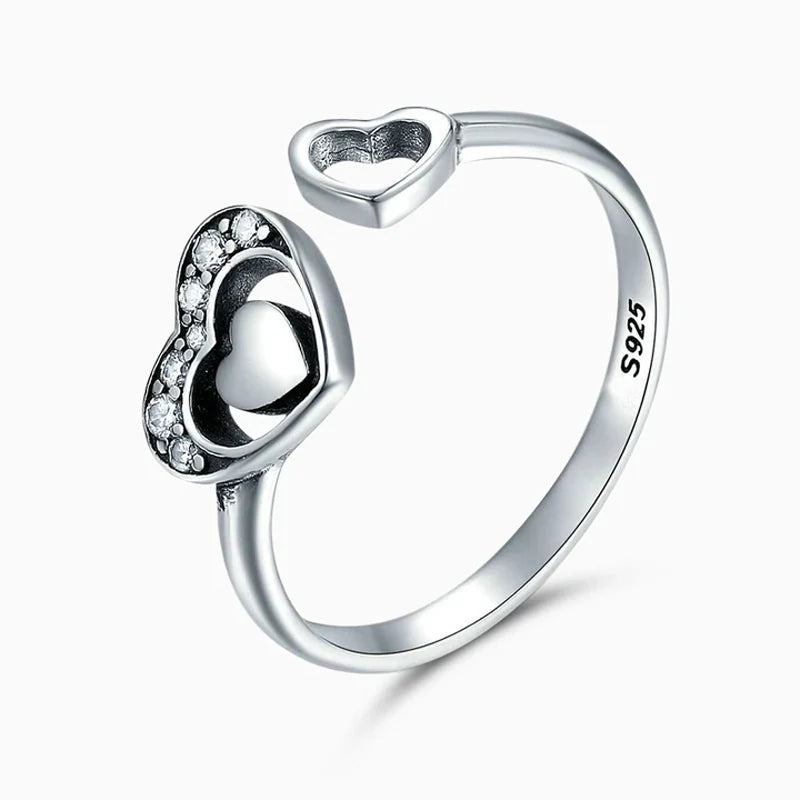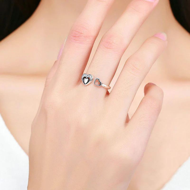 Let your heart shine with the dainty yet striking Enlightened Love Ring. This beautiful open ring features a heart adorned with cubic zirconia stones & a hollow heart on the other end that are all set in 925 Sterling Silver.