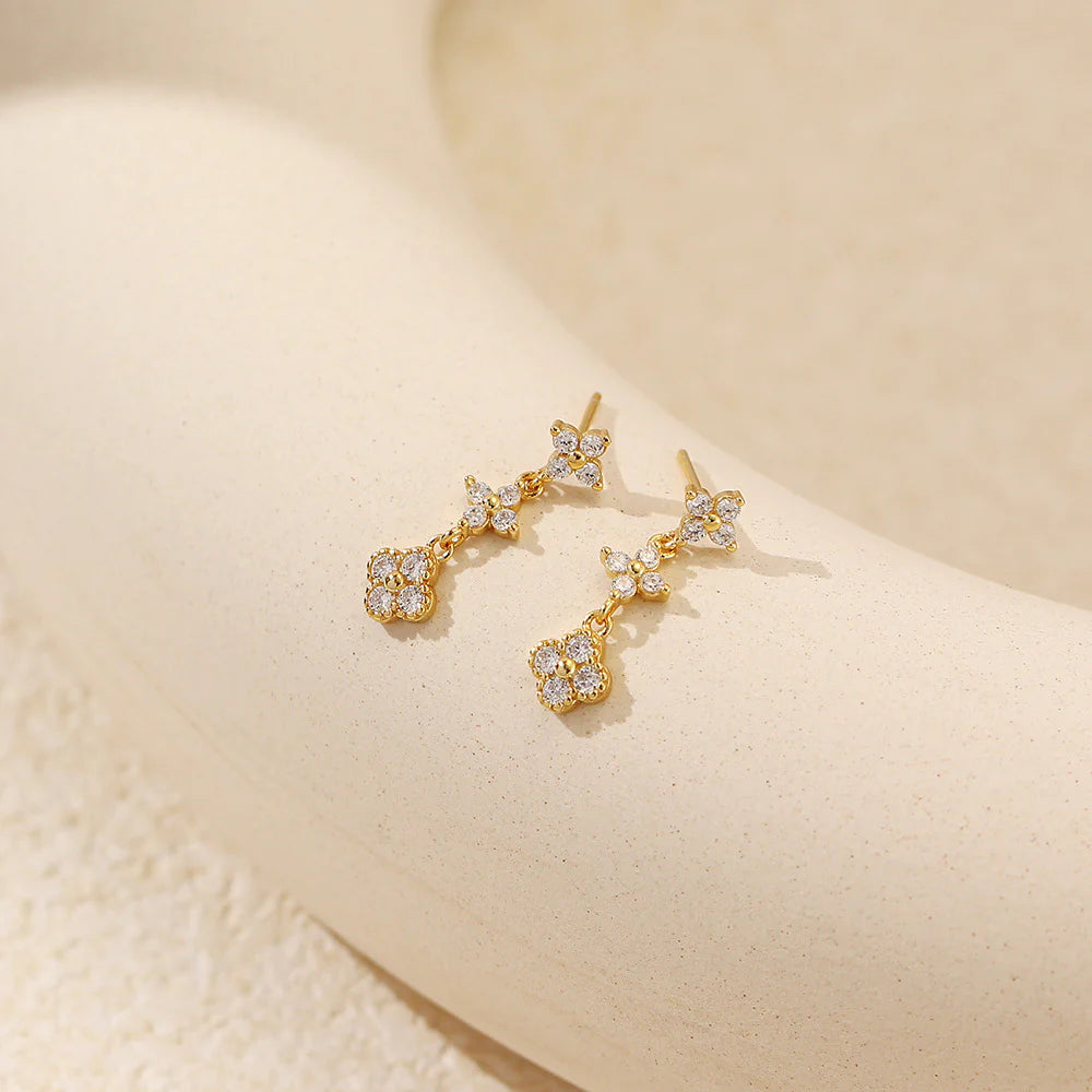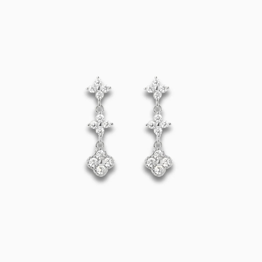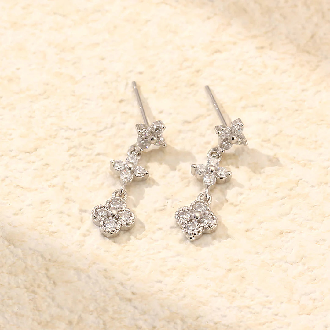 Delicate yet dazzling, the Evelyn Crystal Bloom Earrings embody timeless charm with a celestial twist. Designed with a graceful cascade of clover-like floral clusters, each bloom sparkles with high-shine zircon stones that catch the light with every turn. Their airy silhouette and gentle sway make them the perfect accent for both romantic evenings and effortless daytime elegance. The triple-drop design adds dimension while remaining refined, creating a versatile piece you'll reach for time and again.