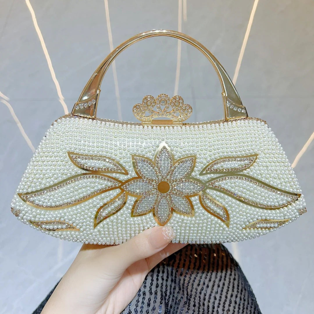 A true masterpiece of elegance, this Evelyn Handbag is a dazzling statement piece. Enveloped in lustrous pearls and accented with intricate gold floral detailing, it exudes opulence with every shimmer. The structured silhouette is crowned with a regal crystal-embellished clasp, adding a touch of vintage glamour. Inside, a silky interior cradles your essentials with luxurious softness, while a detachable chain strap offers versatile styling. The Evelyn is the epitome of sophistication and charm. Exclusively available in gold.