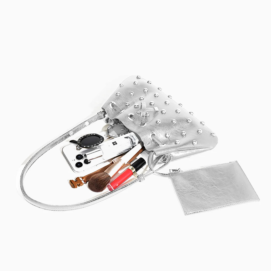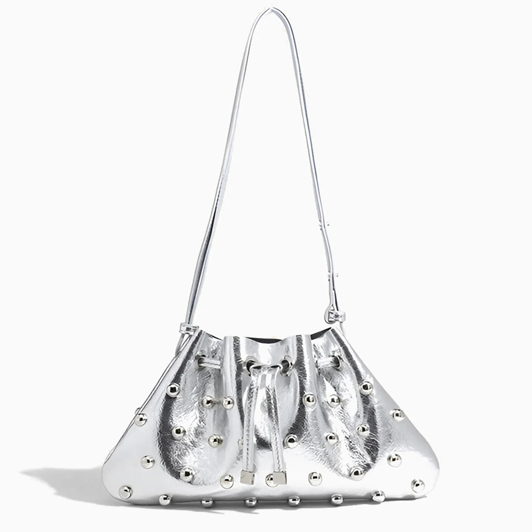 The Georgina Shoulder Bag is a radiant blend of elegance and charm. Designed in a dumpling shape and adorned with silver beads all over, this bag is a true showstopper. The drawstring closure keeps your essentials secure while adding a playful touch to its chic silhouette. With a comfortable strap and high-quality craftsmanship, it’s perfect for elevating both casual and dressy looks. Now available in black and silver.