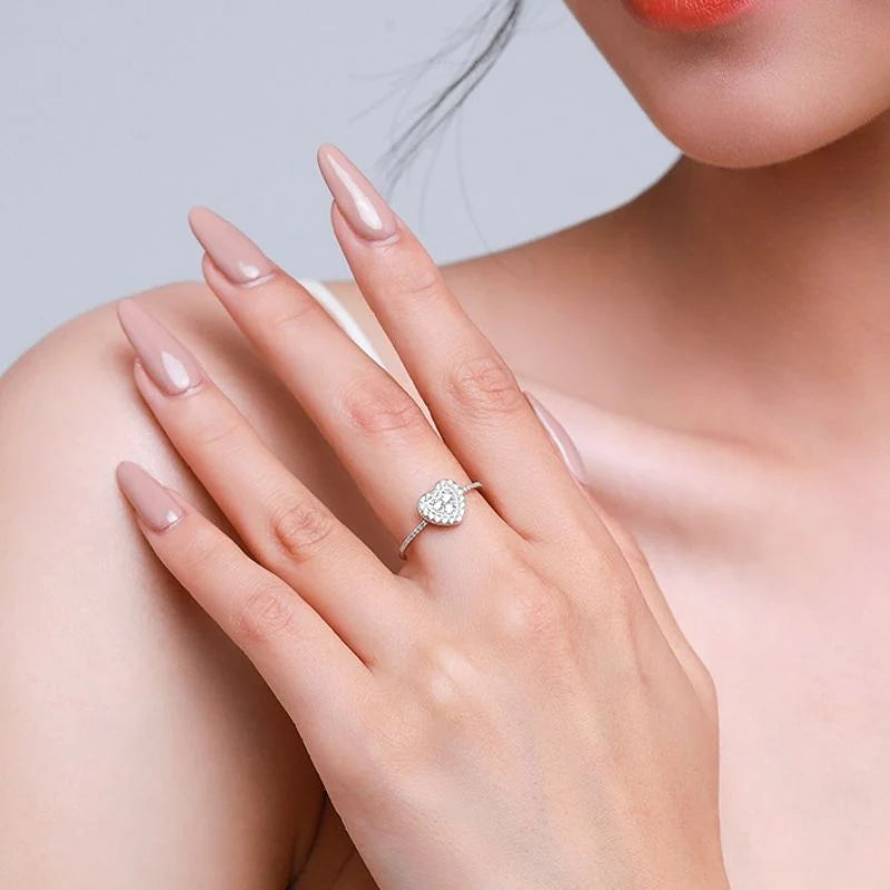 This Heart Mark Ring, made of 925 Sterling Silver is a lovely & delicate piece. It features a small heart inside a huge heart adorned with shiny gems. Now available in gold & silver. This unique ring adds a little sparkle to any look.