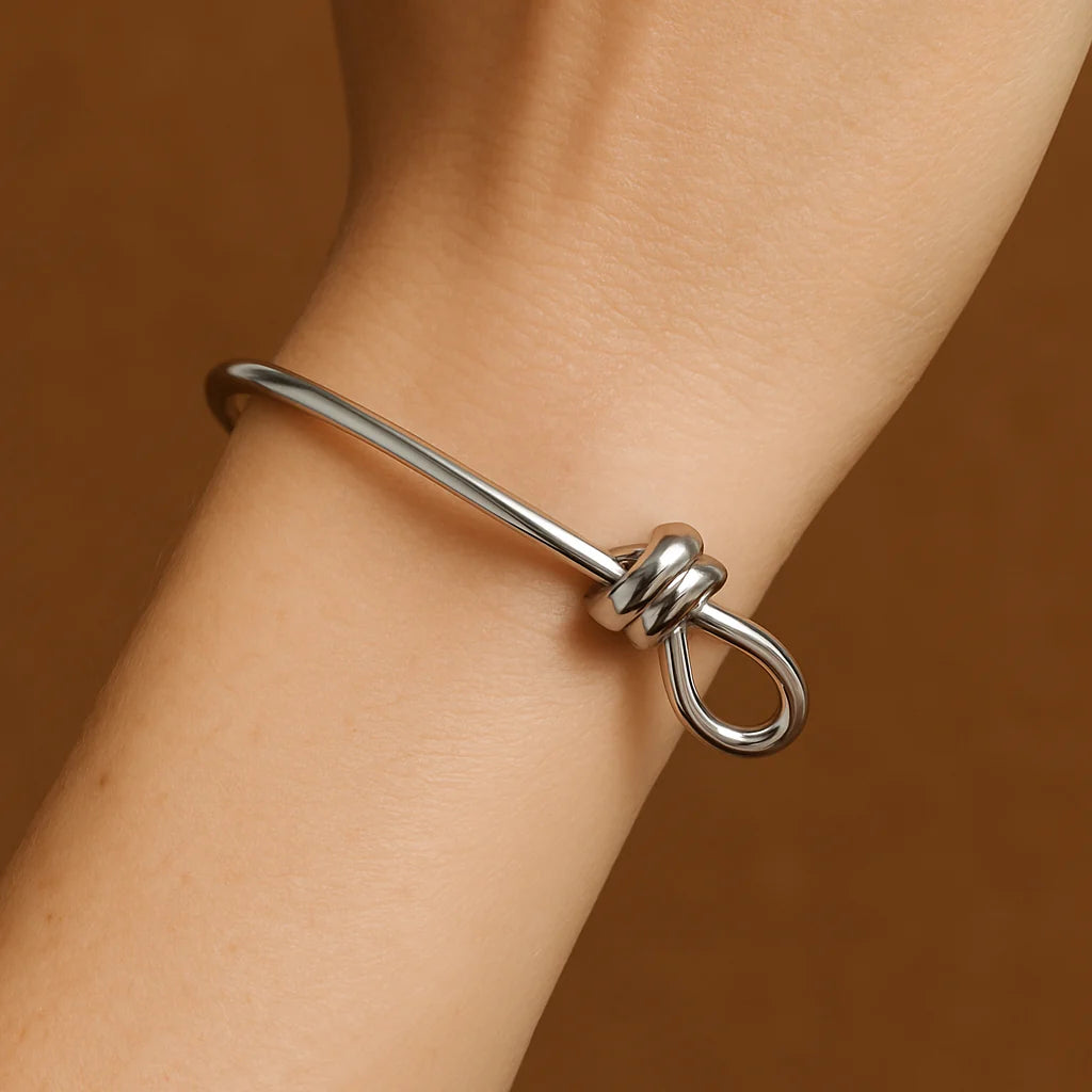 Lina Knot Bracelet captures quiet strength in a single sculptural loop. With its fluid, open-ended design anchored by an elegant twist, this bracelet wraps your wrist in understated confidence and timeless grace. Polished to a mirror sheen, its minimalist form lets the unique knot detail speak volumes—whether worn solo or layered with your everyday stack.