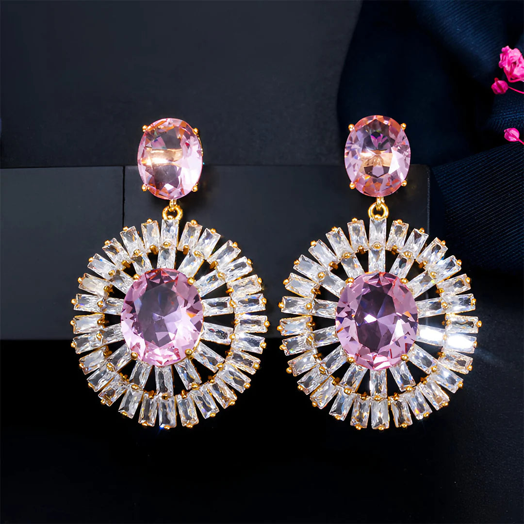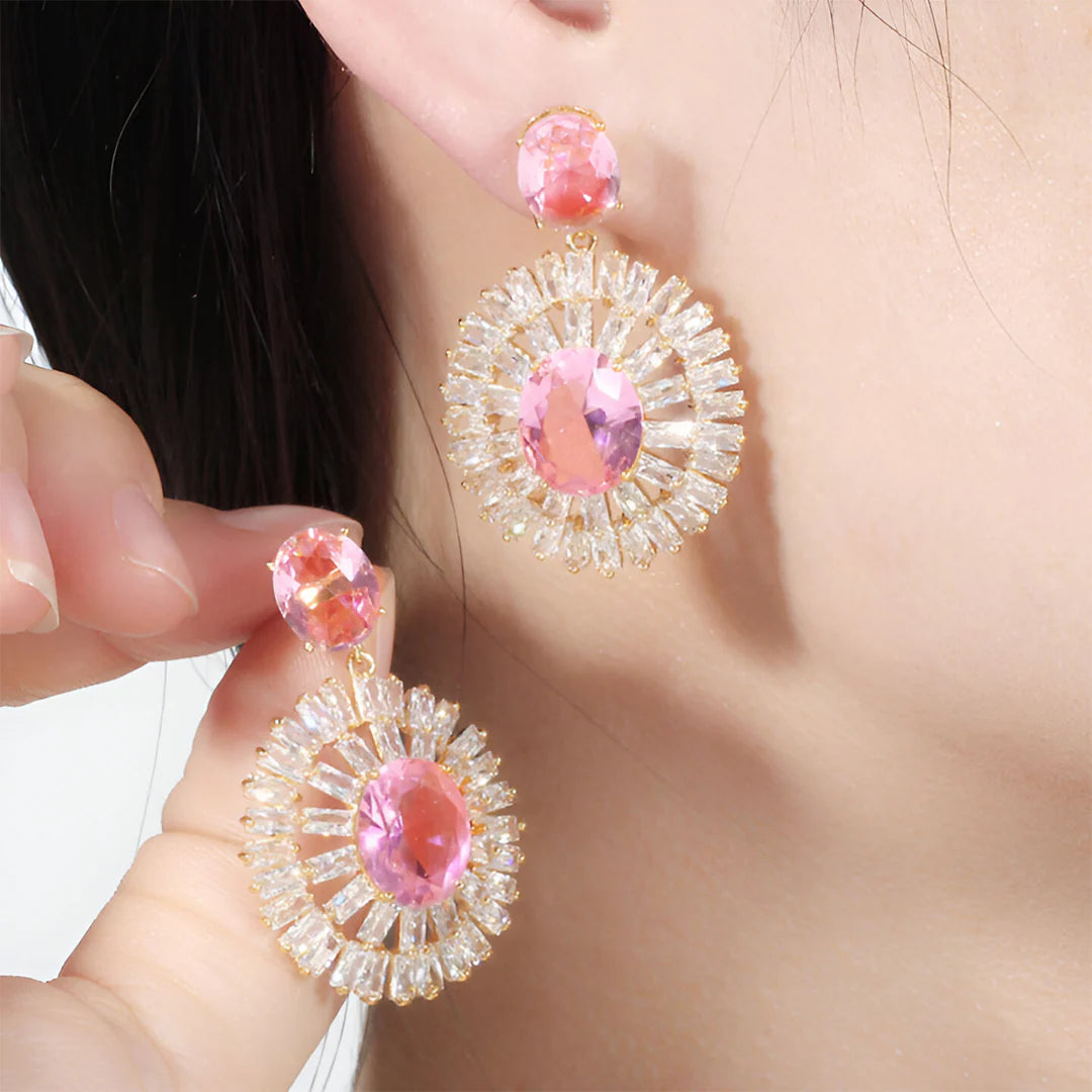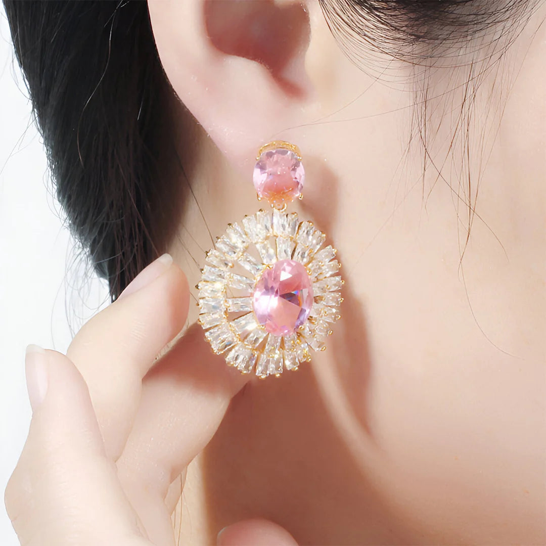 The Lunaira Bloom Earrings exude timeless romance with a radiant burst of light and color. Centered around a luminous pink oval crystal, each earring fans out into a dazzling sunburst of tapered white stones, evoking floral grandeur with a modern edge. Perfect for gala nights or garden weddings, their gleaming symmetry and soft hues strike a balance between drama and grace.
