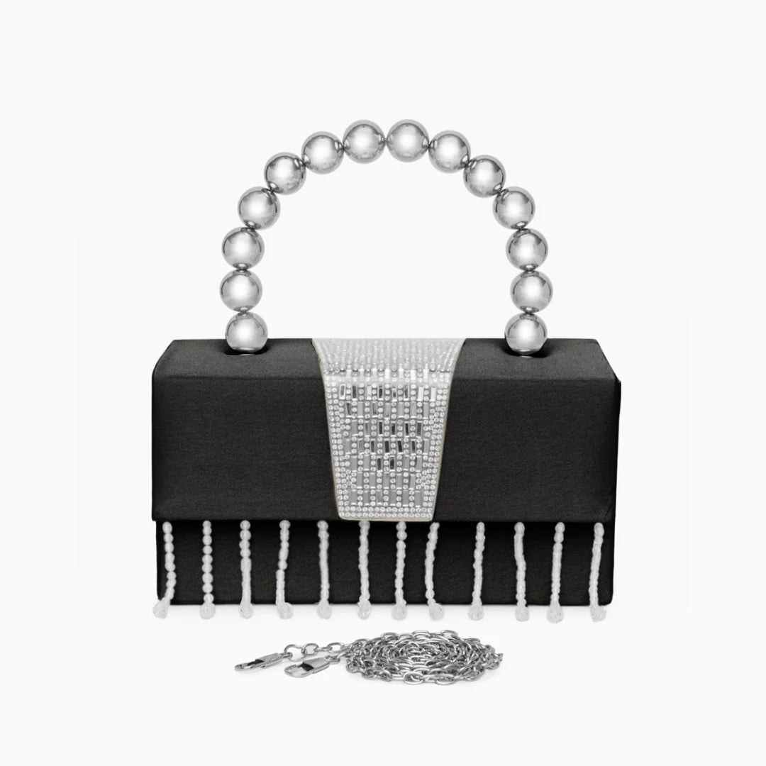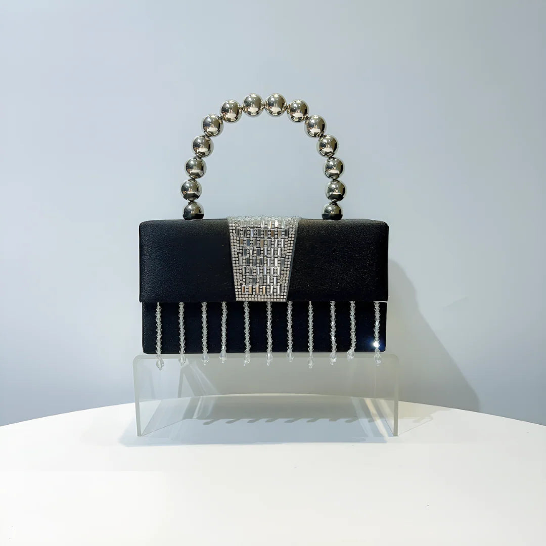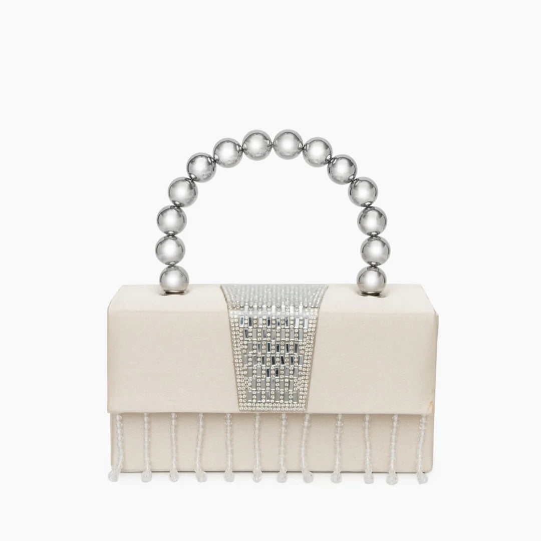 Delicate yet dazzling, the Lunara Pearl Handbag captures the essence of modern glamour with vintage charm. Its satin-like sheen pairs beautifully with a bold rhinestone centerpiece and cascading crystal fringe that sparkles with every step. The rounded bead handle adds a playful elegance, making it ideal for wedding soirées, upscale dinners, or moonlit galas. Compact yet eye-catching, it’s the definiton of refined statement style.