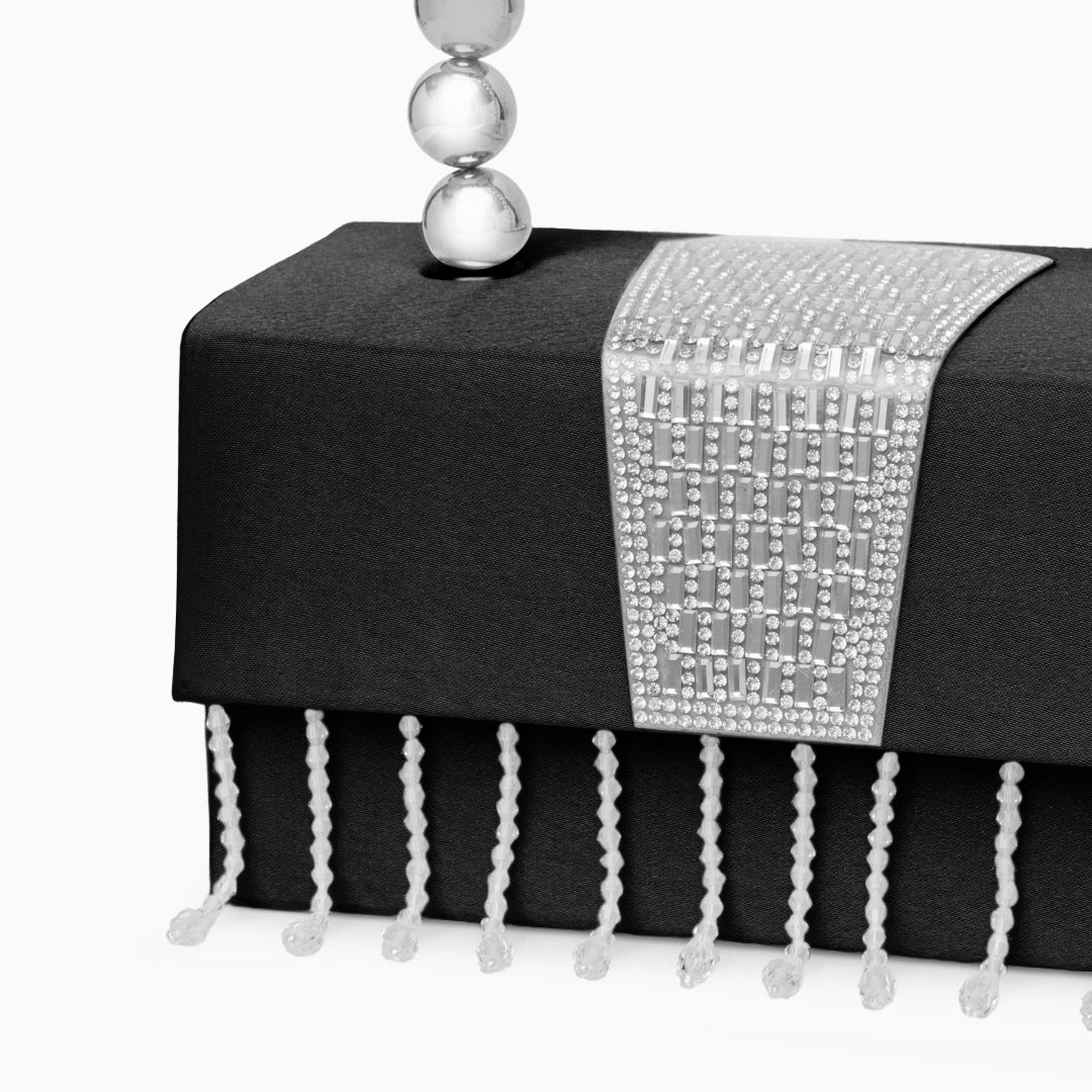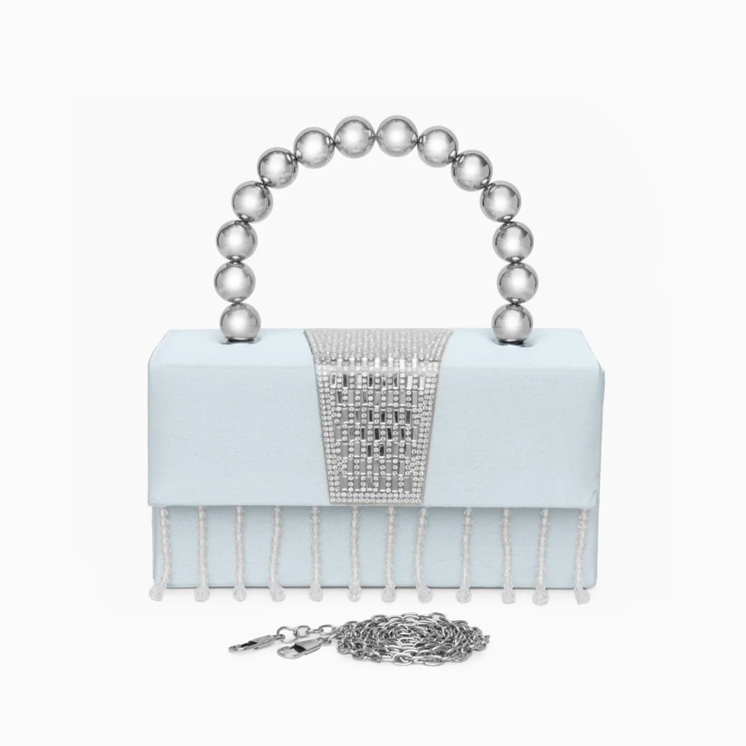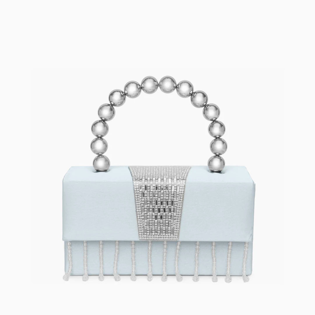 Delicate yet dazzling, the Lunara Pearl Handbag captures the essence of modern glamour with vintage charm. Its satin-like sheen pairs beautifully with a bold rhinestone centerpiece and cascading crystal fringe that sparkles with every step. The rounded bead handle adds a playful elegance, making it ideal for wedding soirées, upscale dinners, or moonlit galas. Compact yet eye-catching, it’s the definiton of refined statement style.