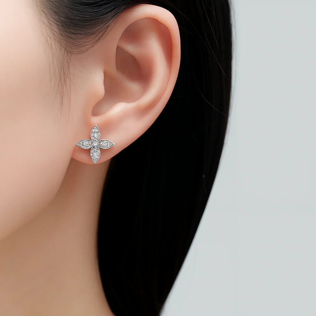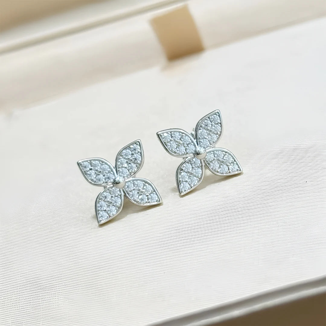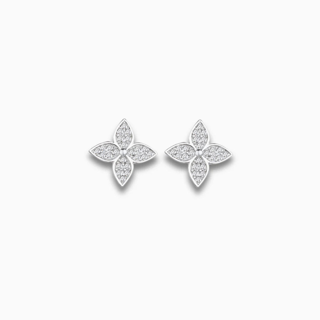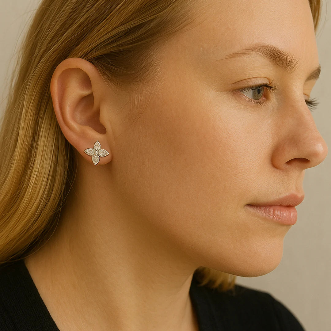Lyra Bloom Frost Earrings bring a poetic shimmer to your look with their delicate four-petal silhouette, blooming in crystal-studded brilliance. Each stud is cast in radiant silver and gold, offering a refined contrast to the intricate pavé texture that catches the light with every movement. These floral-inspired earrings are made to add a hint of frost-kissed glamour to both everyday wear and special occasions.