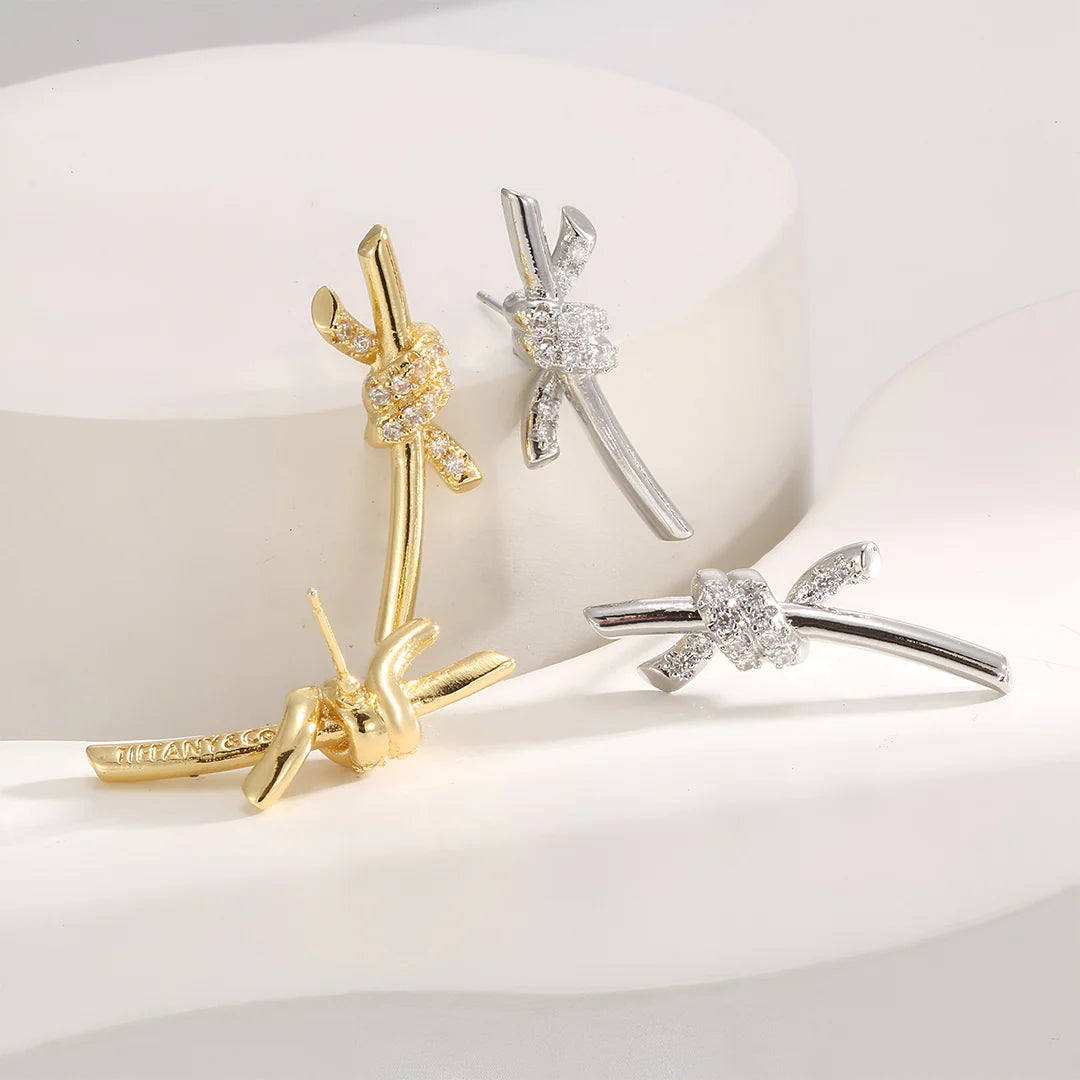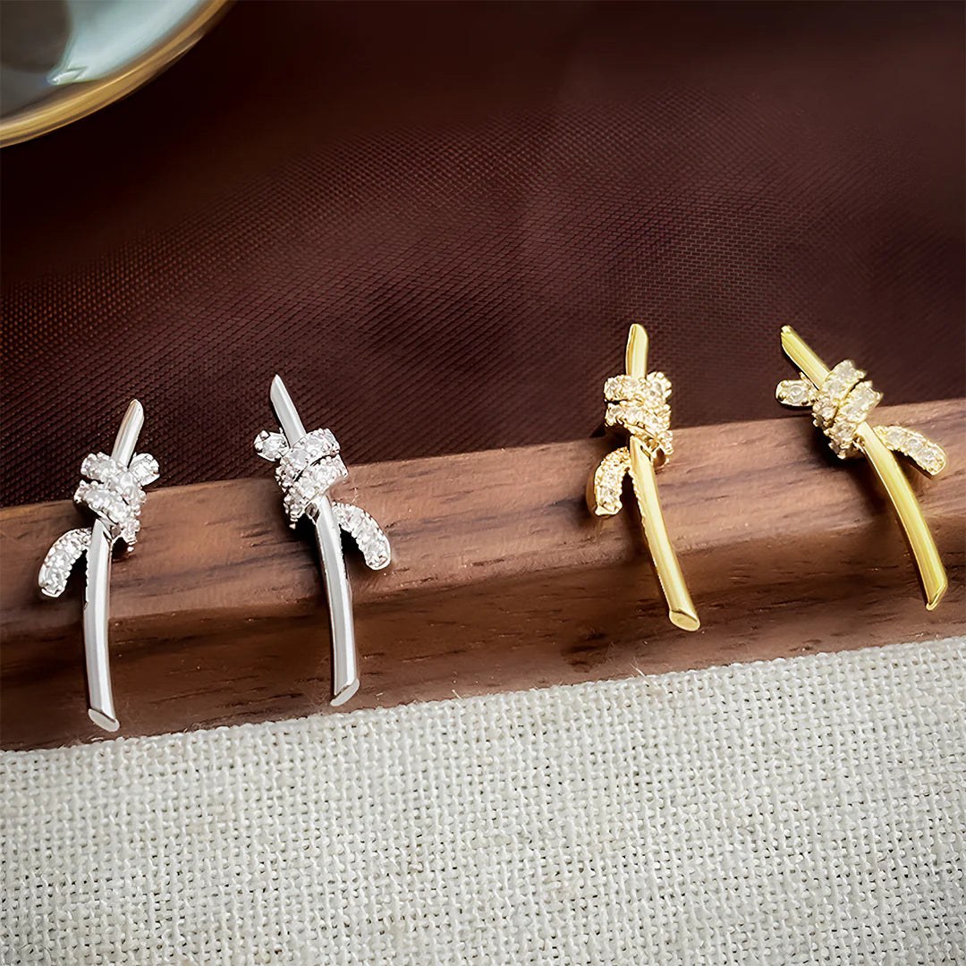 Sculptural and refined, the Lyra Twist Climber earrings curve delicately along the ear, creating a graceful silhouette that catches the light with every move. Their fluid bar design is accented by a shimmering crystal knot motif, lending just the right amount of sparkle for day or night. Elegant craftsmanship – Made from high-quality metal and embellished with cubic zirconia for a luxurious yet lightweight feel. Whether worn solo or layered with studs, they bring a hint of modern edge to timeless elegance.