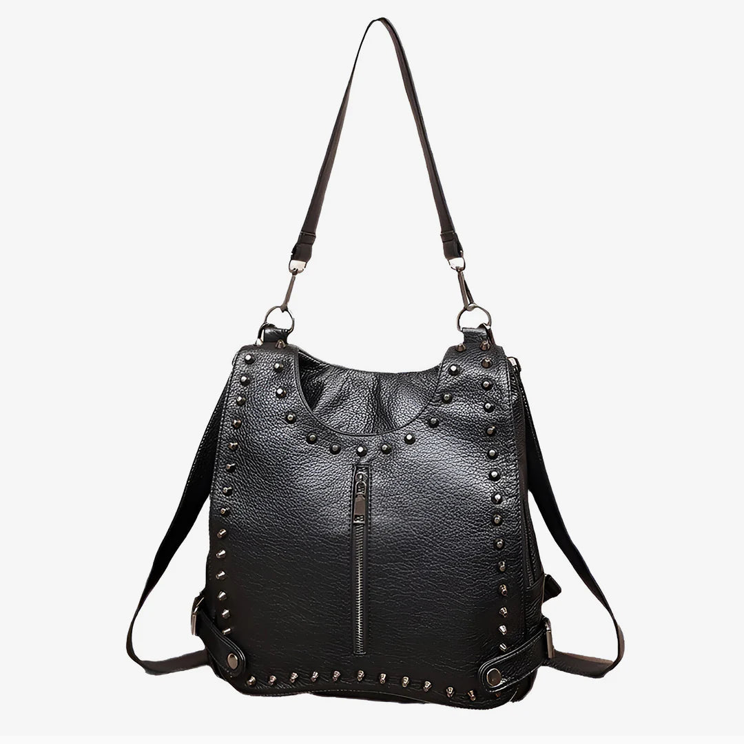 Bold, edgy, and endlessly versatile — the Milani Backpack is where street-smart design meets daily functionality. Crafted from durable, textured material with a subtle grain, this piece is as stylish as it is sturdy. Stud embellishments outline its silhouette, giving it a rebellious charm. Featuring multiple compartments, the Milani is designed for your on-the-go lifestyle. With its convertible straps, you can rock it as a backpack, sling it over one shoulder, or carry it by the top handle for a quick grab-and-go moment. It’s the all-day, everyday bag that stands out! Exclusively available in black.