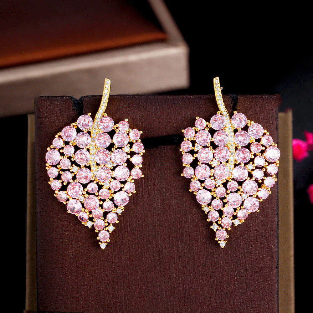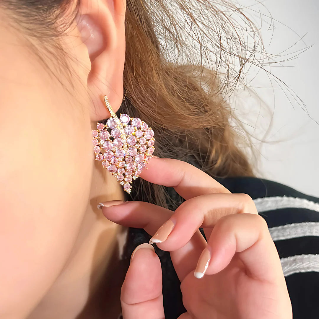 The Noura Petal Bloom Earrings capture the delicate grace of spring blossoms in full flourish. Shaped like cascading leaves, they dazzle with a mosaic of blush-pink stones, each one meticulously arranged to echo nature’s effortless elegance. A slender golden stem, dusted with clear crystals, adds vertical lift and shimmer, making these a captivating choice for romantic evenings or festive affairs. Feminine, floral, and full of light, they’re a radiant ode to beauty in bloom.