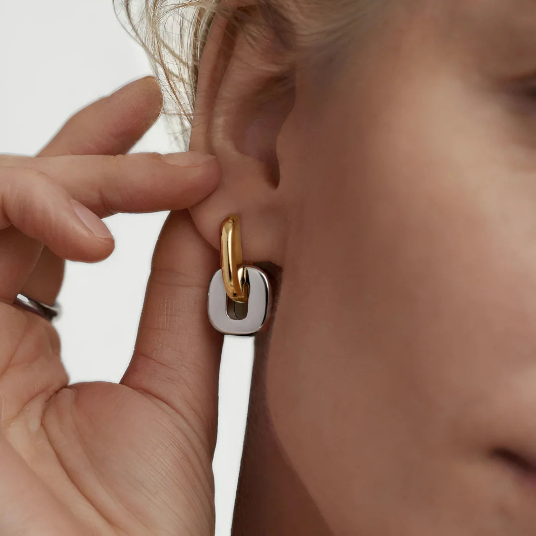 A modern twist on timeless dual-tone elegance, the Nova Link Earrings feature interlocking gold and silver-toned links that create an effortlessly sculptural silhouette. Their clean, minimalist form speaks to contemporary luxury, while the contrasting finishes add depth and dynamic charm. Perfectly weighted for daily wear, these earrings make a subtle statement with every turn of the head.