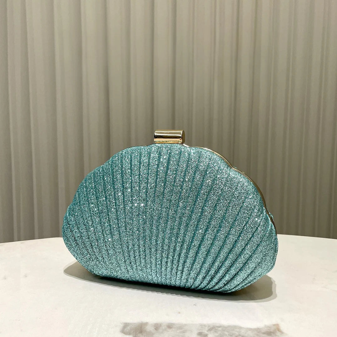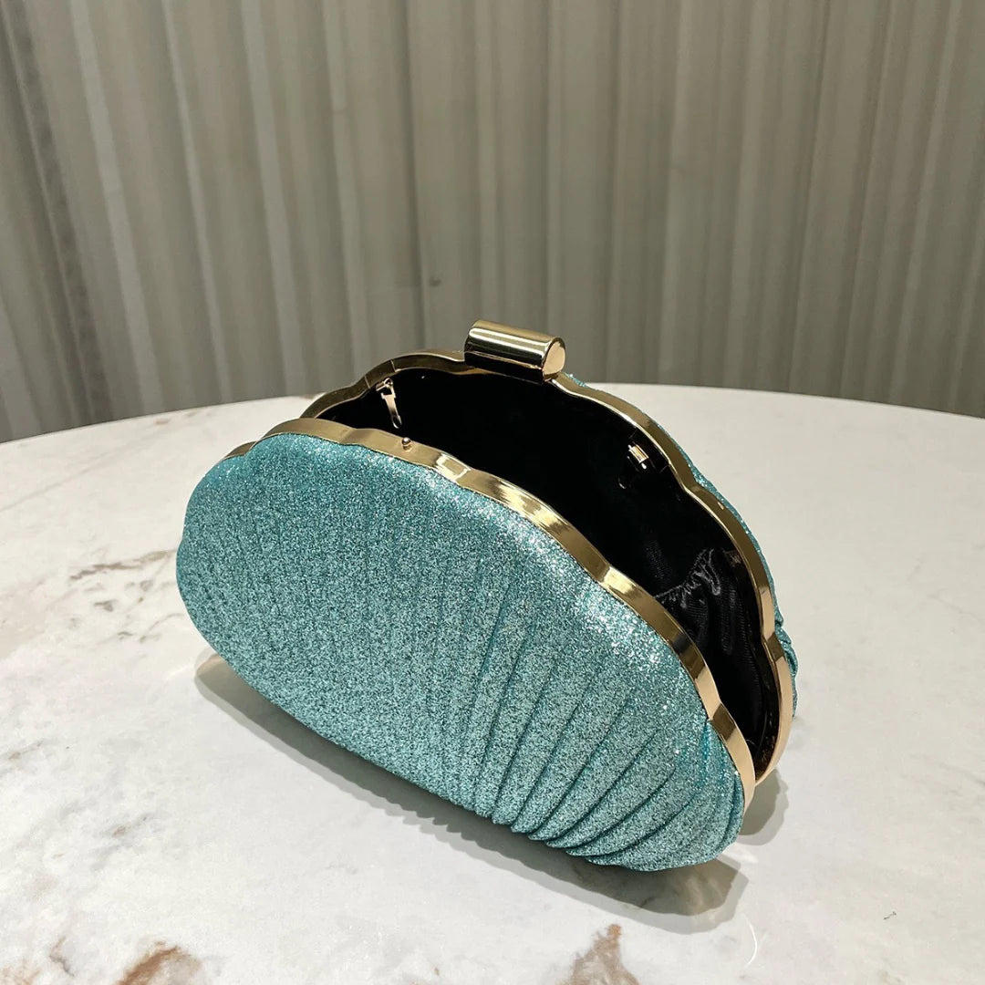 Channel mermaid-core glam with the enchanting Ocean Bloom Clutch Bag, sculpted in a radiant seashell silhouette. This dazzling teal clutch shimmers with fine glitter, giving the illusion of sunlight dancing on ocean waves. Its unique shape and structured pleats make it a standout for coastal weddings, summer soirées, or any evening look that craves a touch of magic. Finished with a sleek gold clasp, it blends whimsy with sophistication effortlessly.