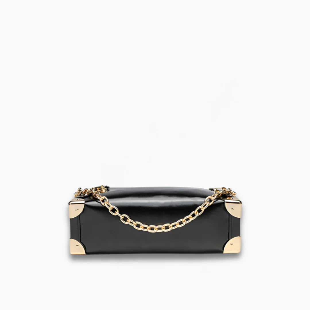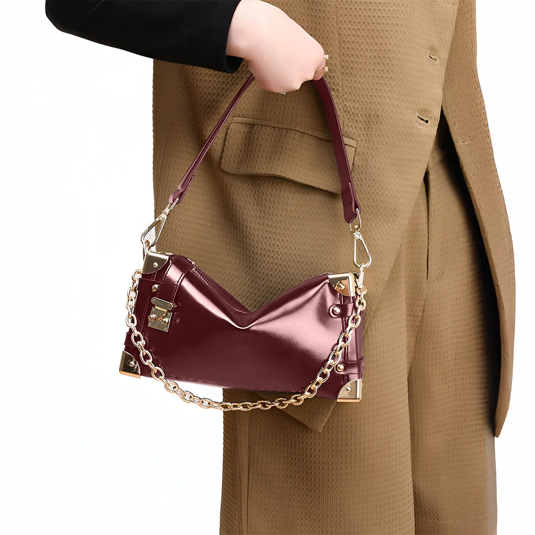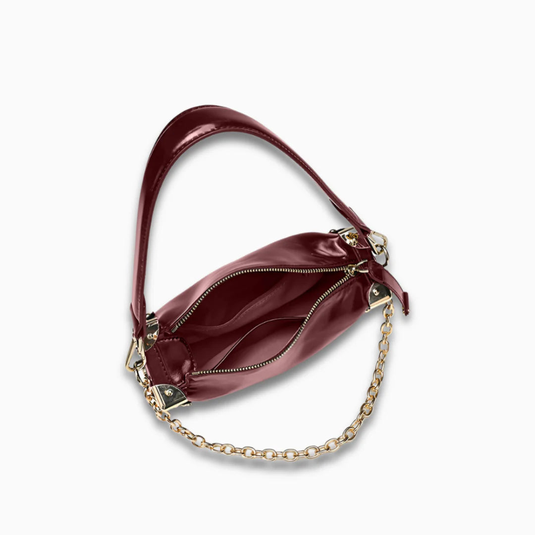 The Ophelia Shoulder Bag is where fierce meets finesse. Crafted from smooth, high-shine leather, this piece commands luxury. Structured yet daring, this bag features a v-fold top that adds a sculptural twist. The zipper closure seals your essentials with sleek precision while gleaming gold-tone hardware — including luxe corner brackets, a statement chain trim, and dual strap hooks. The design includes a classic shoulder strap and a detachable crossbody option, giving you styling freedom in one stunning package! Now available in black and burgundy.