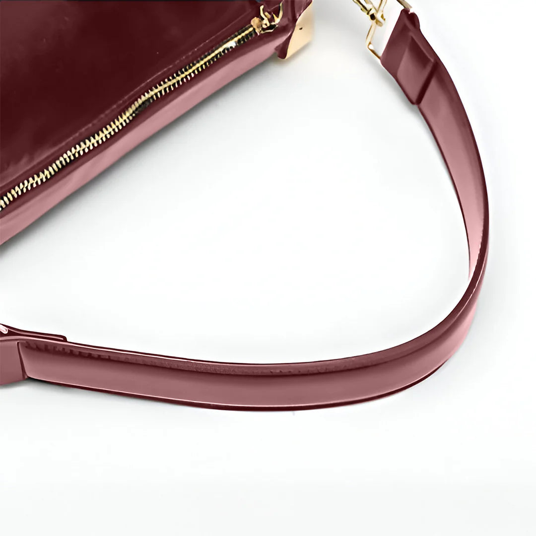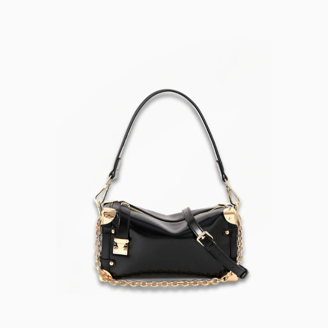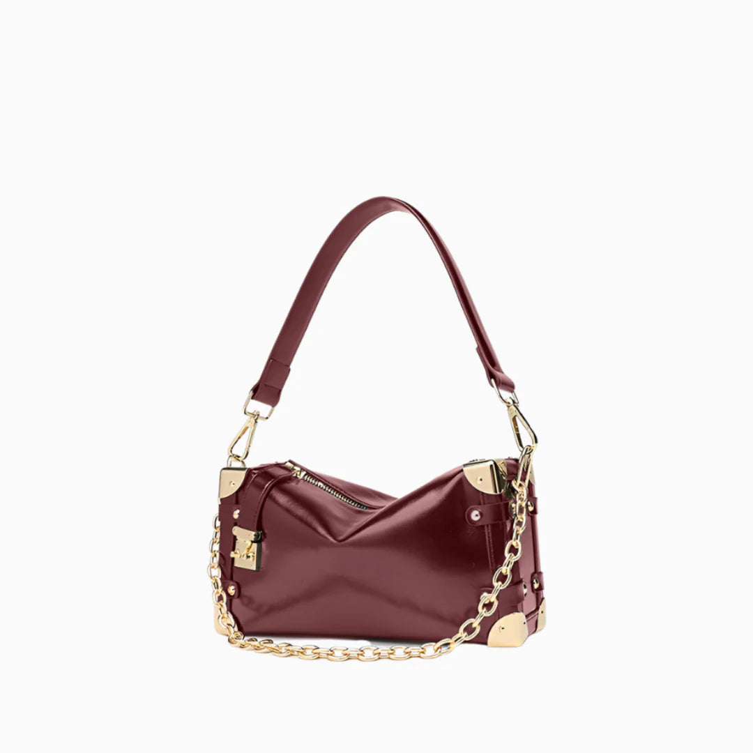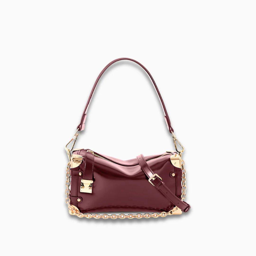The Ophelia Shoulder Bag is where fierce meets finesse. Crafted from smooth, high-shine leather, this piece commands luxury. Structured yet daring, this bag features a v-fold top that adds a sculptural twist. The zipper closure seals your essentials with sleek precision while gleaming gold-tone hardware — including luxe corner brackets, a statement chain trim, and dual strap hooks. The design includes a classic shoulder strap and a detachable crossbody option, giving you styling freedom in one stunning package! Now available in black and burgundy.