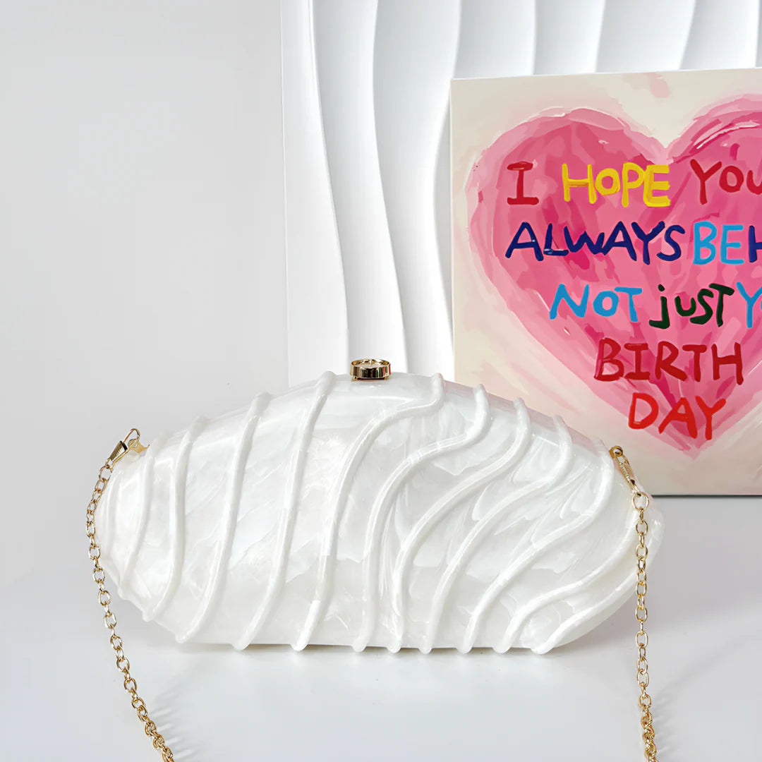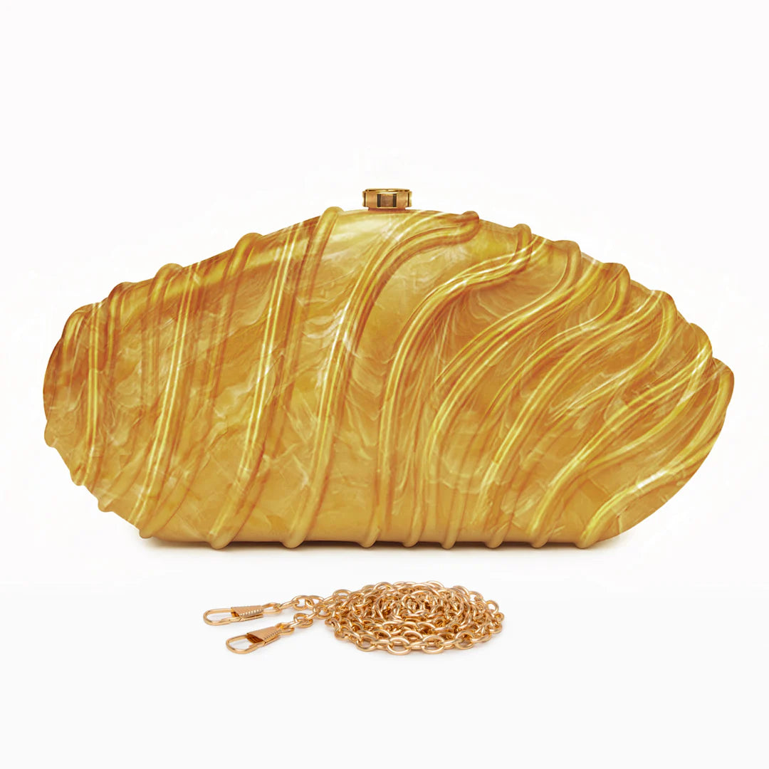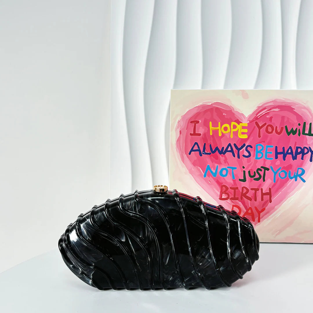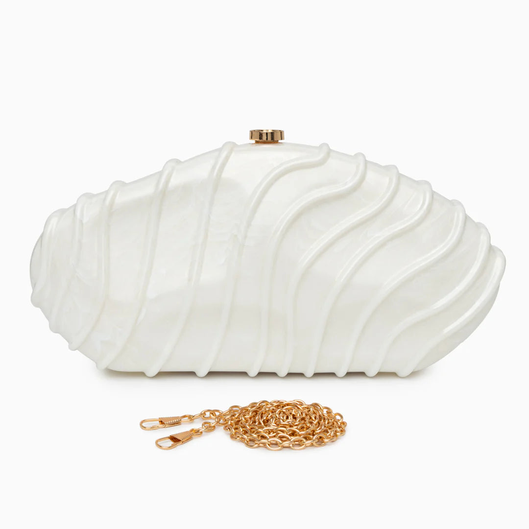 Futuristic and fierce, the Ravyn Shell Clutch Bag redefines statement clutches with its sculptural silhouette. Wrapped in sleek, rippled contours over a high-gloss finish, this piece channels avant-garde elegance with an edge. Its oblong form fits comfortably in hand, while the secure top clasp keeps essentials close and chic. A showstopper for fashion-forward evenings or gallery affairs.