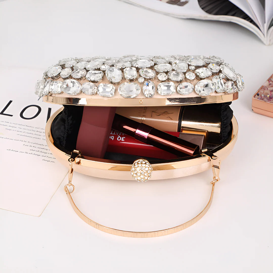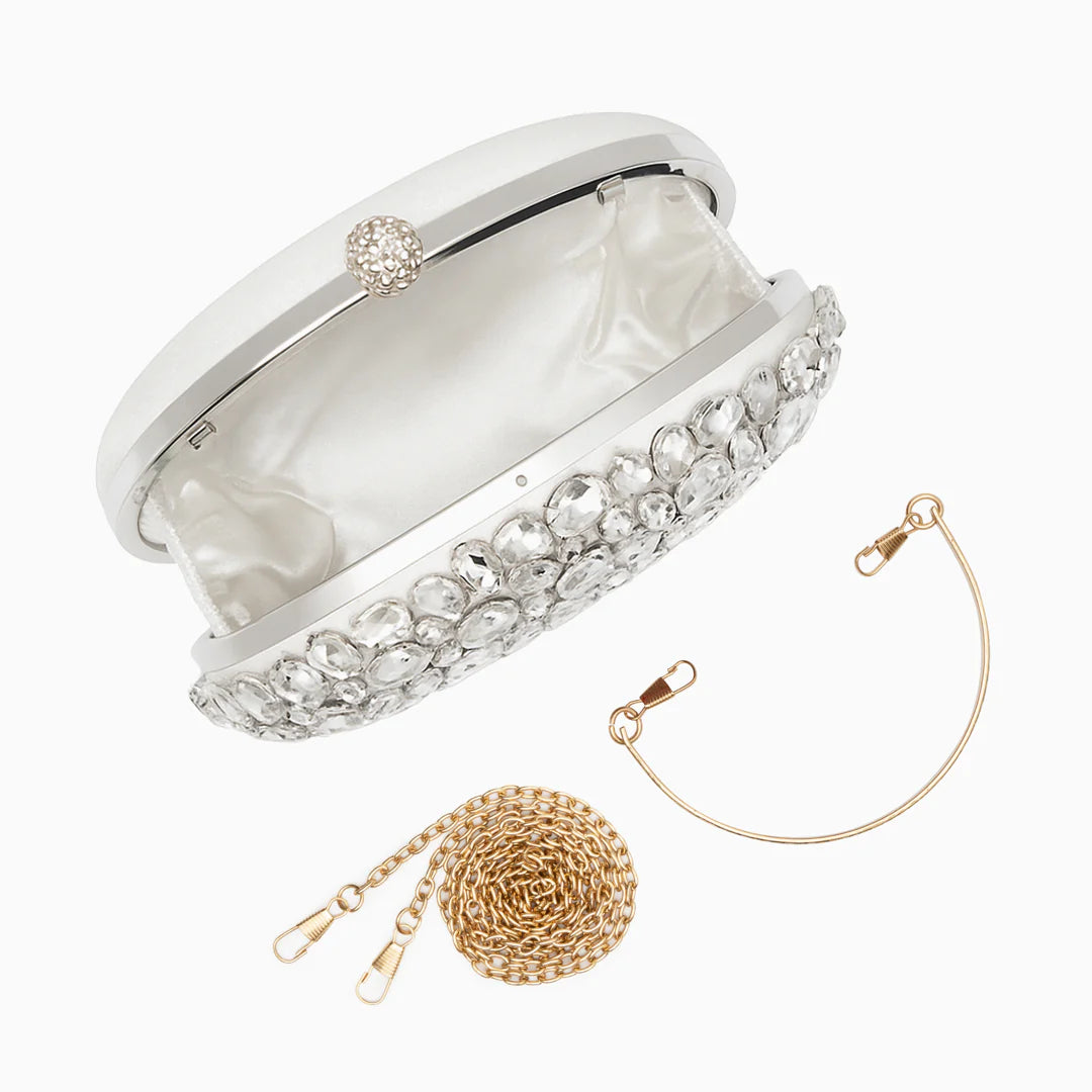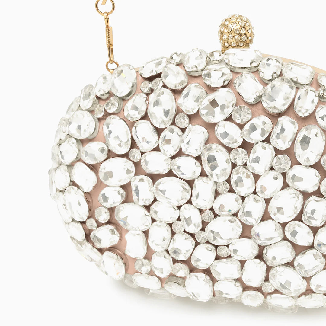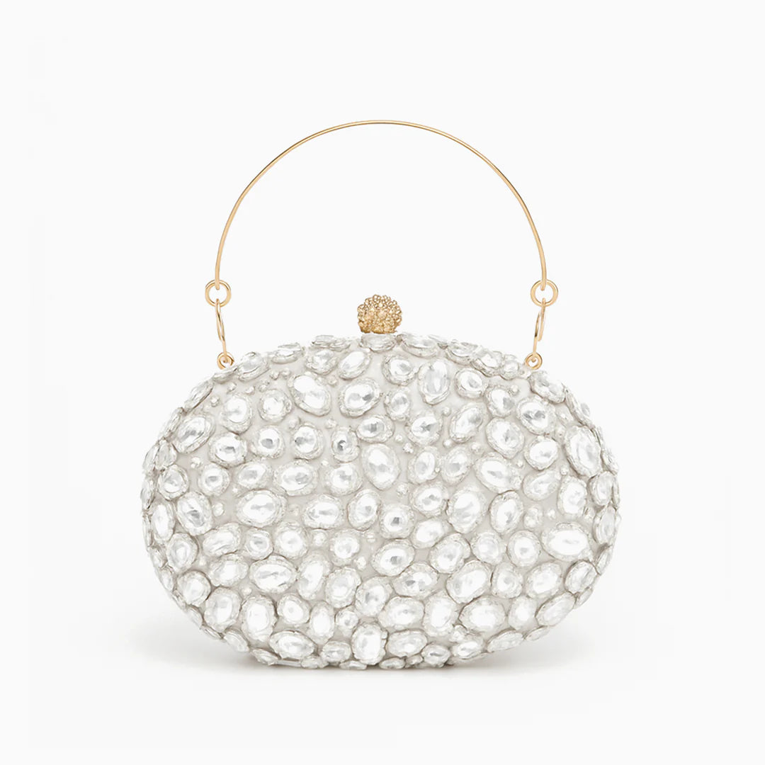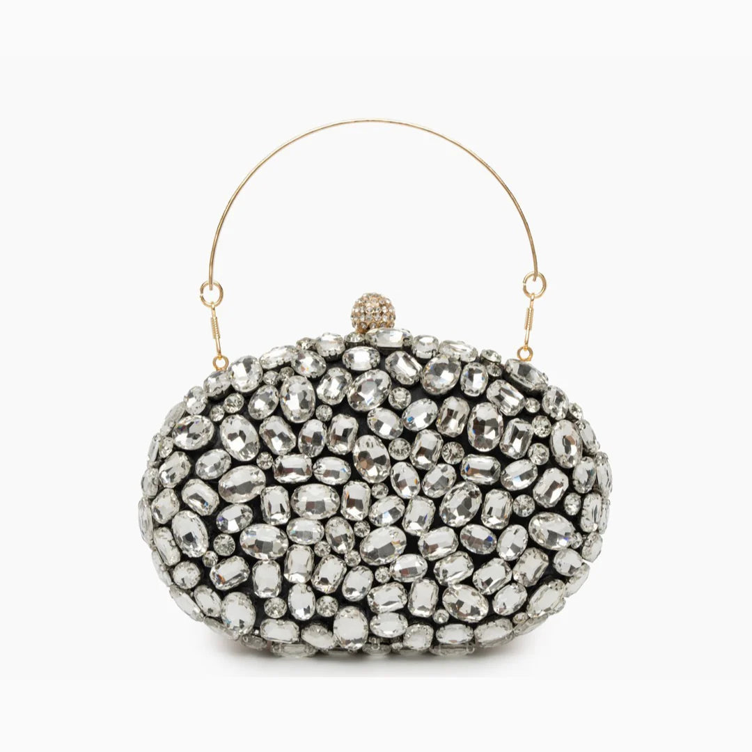 Drape yourself in glamour with the Seraphine Gemstone Clutch Bag, a radiant clutch covered in shimmering rhinestones that catch light from every angle. Designed to dazzle at any upscale occasion, this oval-shaped piece brings opulence without apology. The push-lock crystal clasp adds a final jewel-like touch, while the compact size holds your party-night essentials in perfect form. It's the kind of clutch that turns heads and cements memories, whether you're dancing under chandeliers or toasting at midnight.