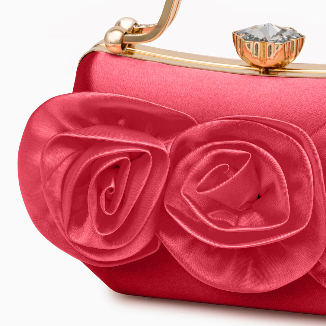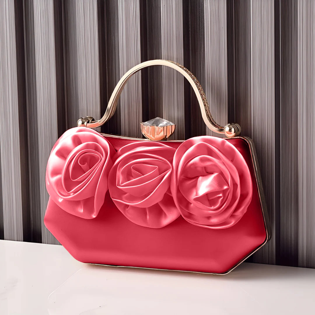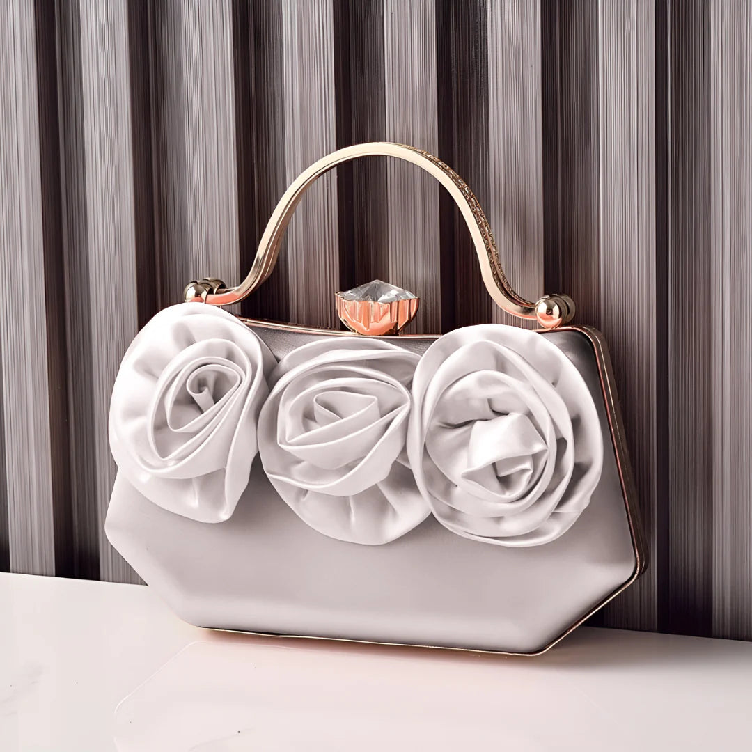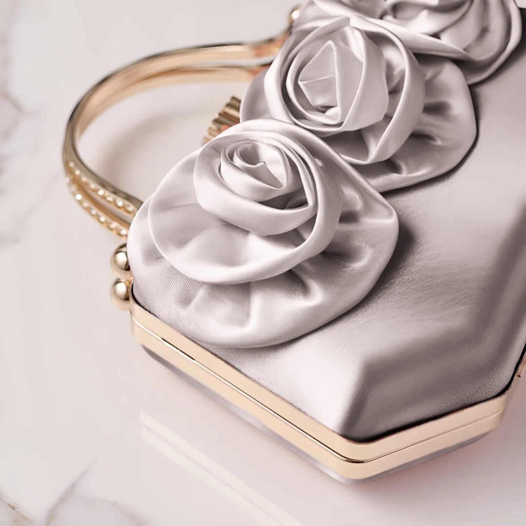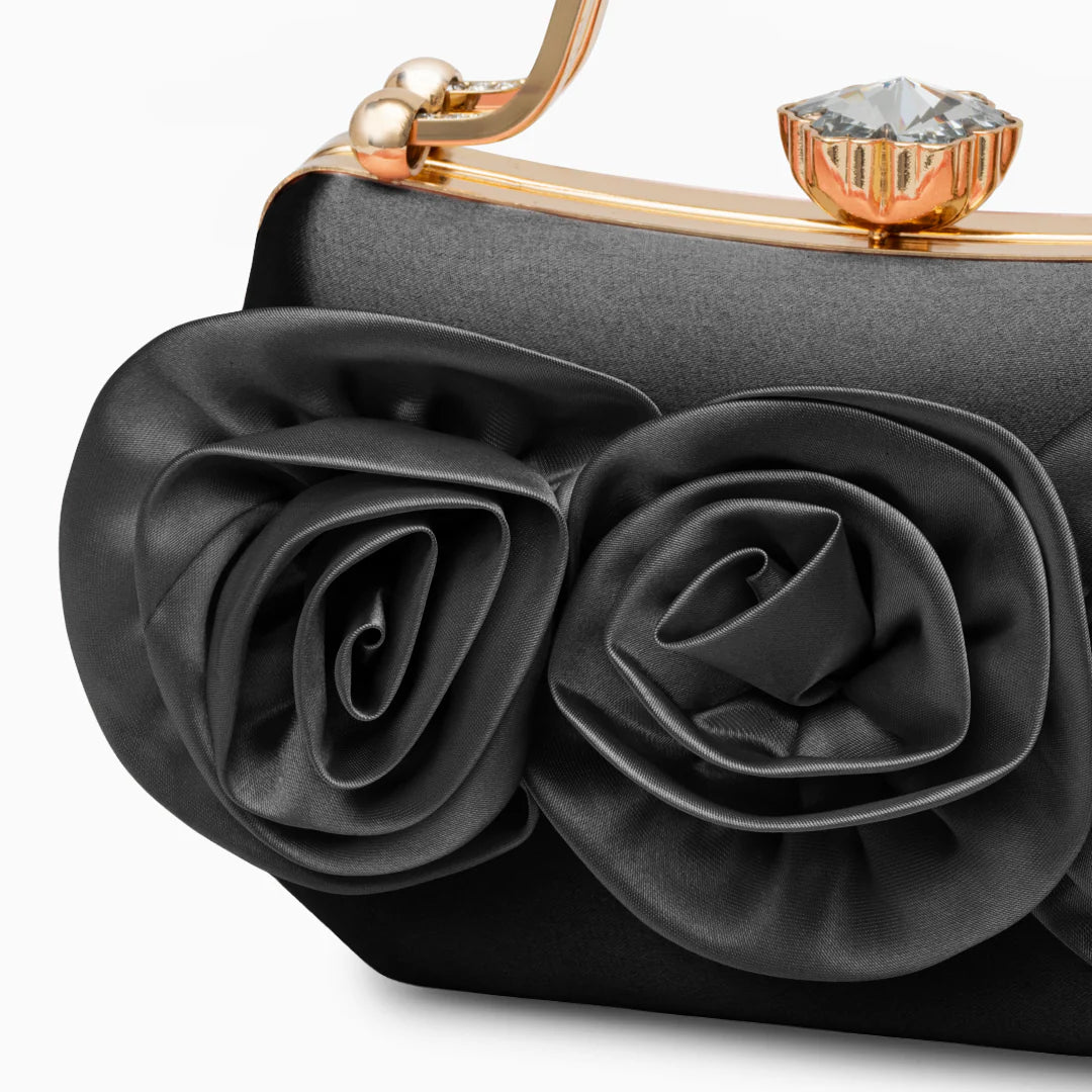 Designed to dazzle, the Soleia Bloom Clutch Bag is a floral fantasy wrapped in satin perfection. With sculpted rose appliqués and a jewel clasp, this clutch captures the romance of vintage elegance with a modern twist. Its structured shape and polished handle make it ideal for weddings, soirées, or any moment worth remembering. Add a dreamy, feminine accent to your evening look with this enchanting piece.