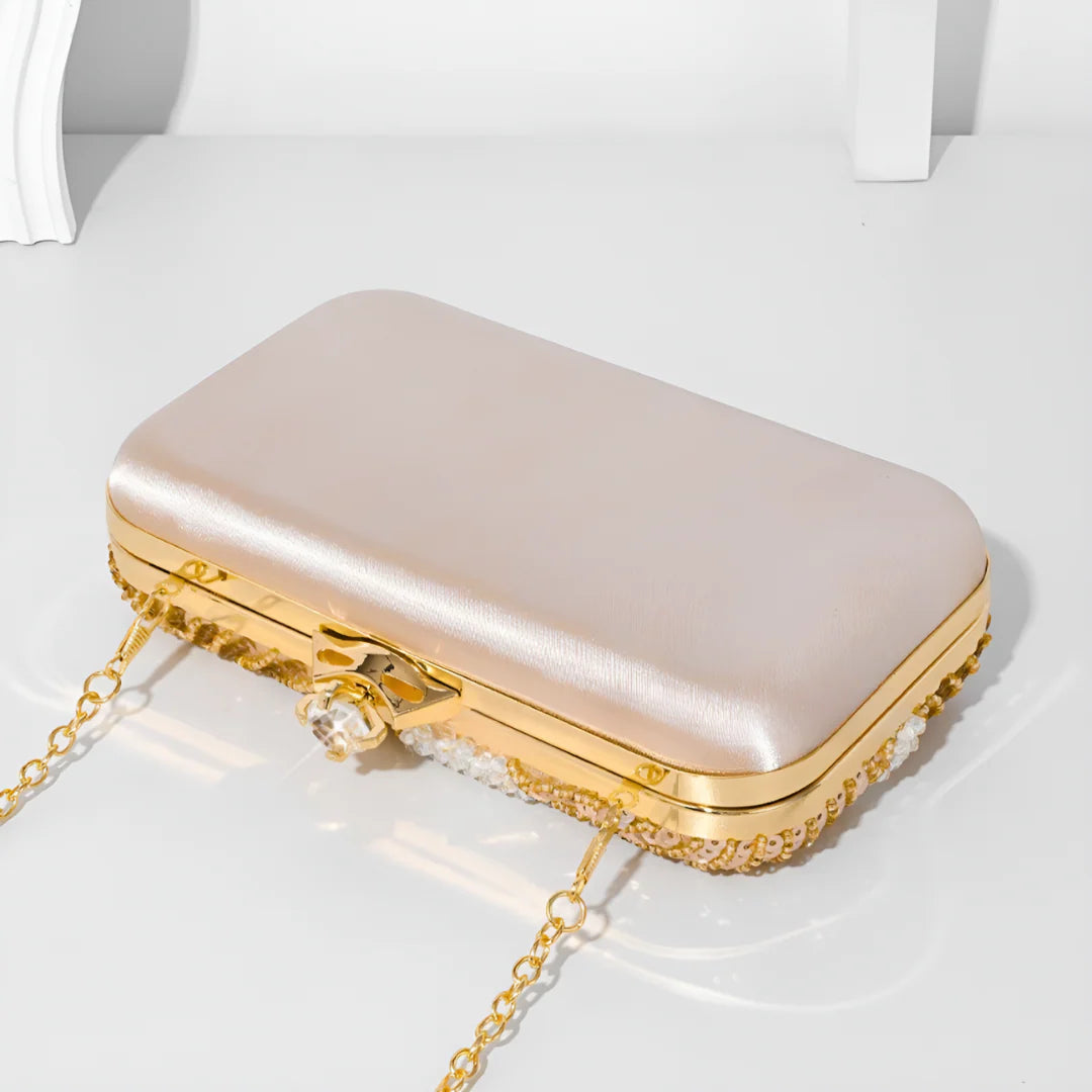 The Solene Beadwork Handbag radiates artisanal charm with a dazzling sunburst motif in soft blush and gold tones. Intricately adorned with pearlescent beads and shimmering sequins, each panel is a celebration of texture and light. Its structured rectangular frame is topped with a kiss-lock clasp, bringing vintage glamour to your evening look. The slender metal handle adds polish, while the compact size holds just your elegant essentials. Perfect for weddings, garden parties, or holiday soirées where elegance meets sparkle.