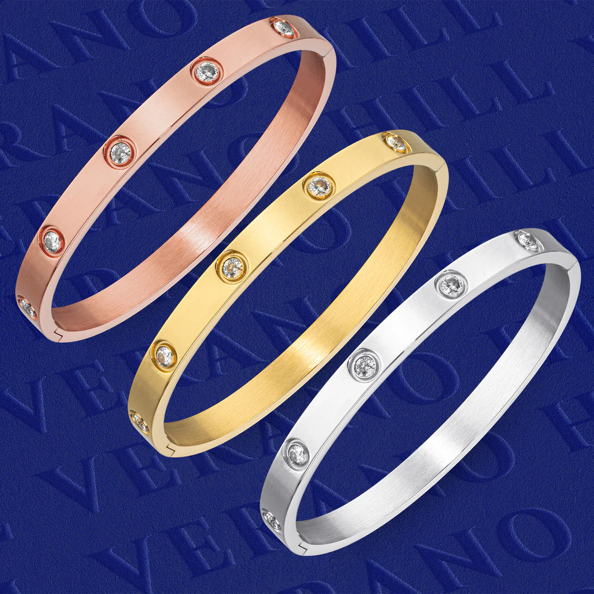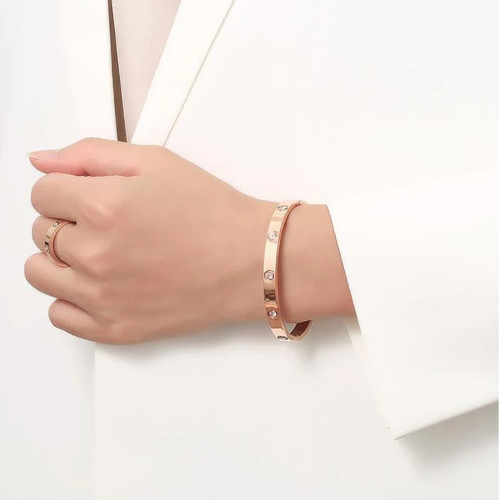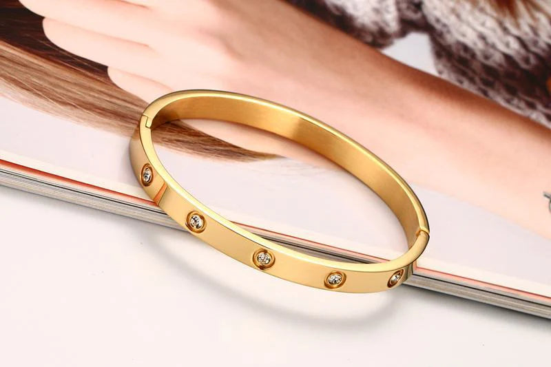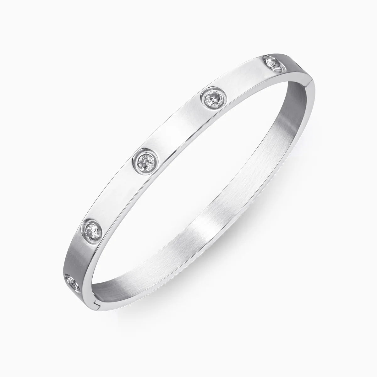 The studded all around sparkling stones on this bangle catch the light and reflect it in a wondrous display of brilliance. Crafted with titanium steel; this bangle provides maximized durability, is lightweight, comfortable to wear and does not tarnish. Now comes in 3 colors: silver, gold and rose gold. The sparkle and shine of this bangle will give a nice elegant touch to any look for any occasion.