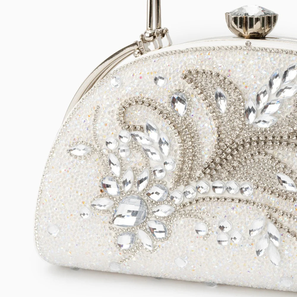 This captivating clutch bag features intricate and mesmerizing designs, adding an ethereal charm to any outfit. Its lightweight construction ensures effortless carrying, while its distinctive allure transforms even the most basic ensembles into sophisticated statements. Versatile for any occasion, this clutch is crafted to accommodate all your essentials with style. Exclusively available in white.