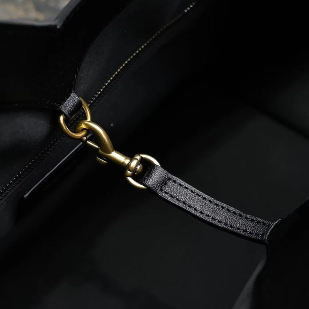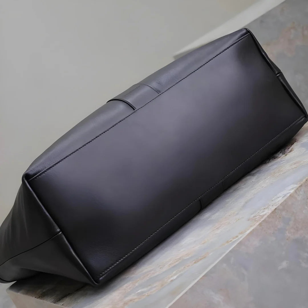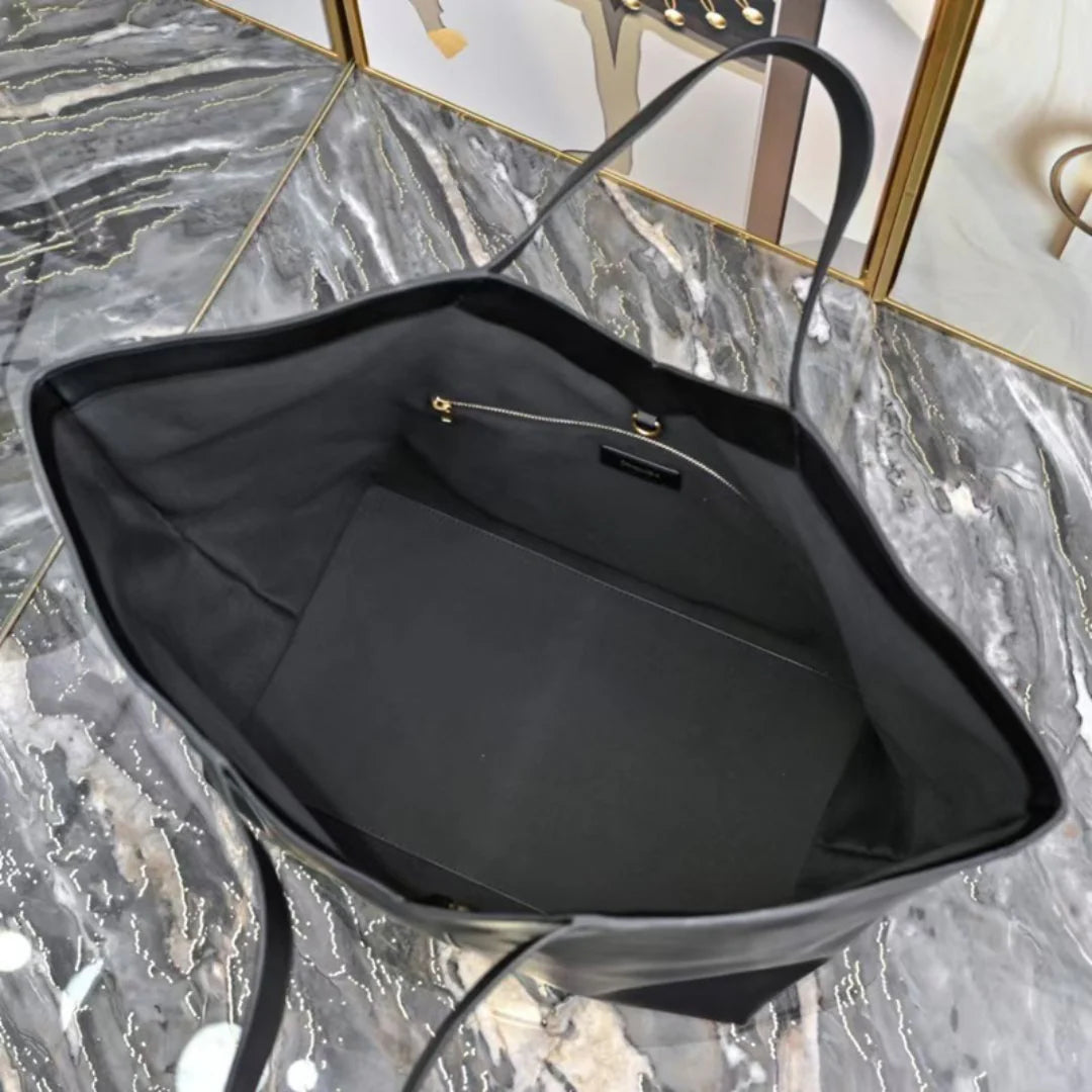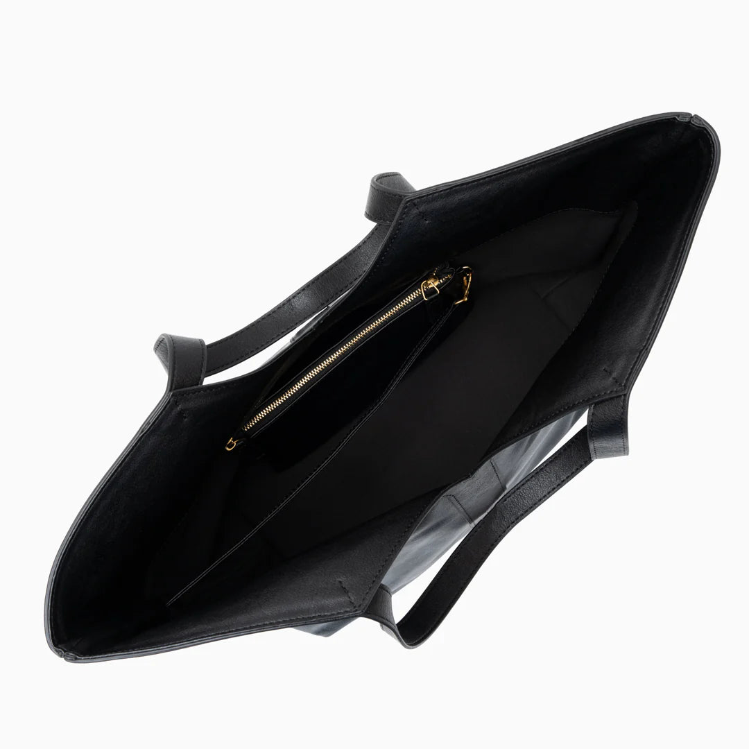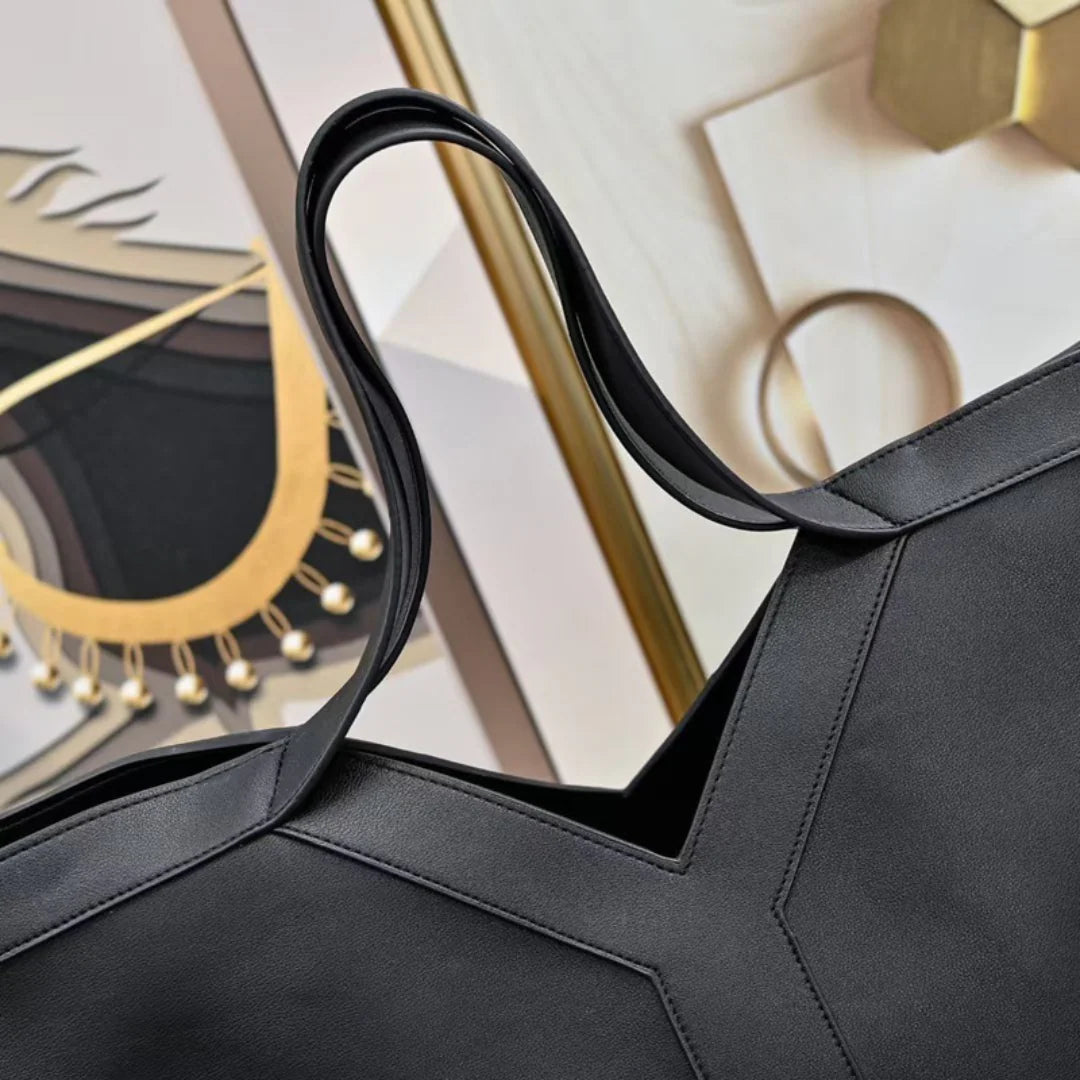 Meet the Trina Tote Bag, your new go-to companion for both workdays and weekends. With its bold Y-shaped detail in the middle, this bag features a stunning fan-shaped silhouette that makes a chic statement wherever you go. Crafted from soft genuine leather, it offers a luxurious feel while remaining incredibly functional and spacious. The laid-back style combined with its solid color makes it a versatile choice, easy to pair with almost any outfit. The Trina Tote is designed to carry your things in elegance and style, all while keeping you effortlessly organized. Exclusively available in black.