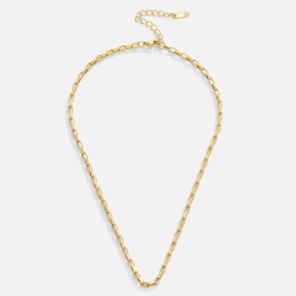 This Venna Necklace, with its chain of golden rectangles, offers a minimalist design that adds a touch of refined style to both casual and formal outfits.