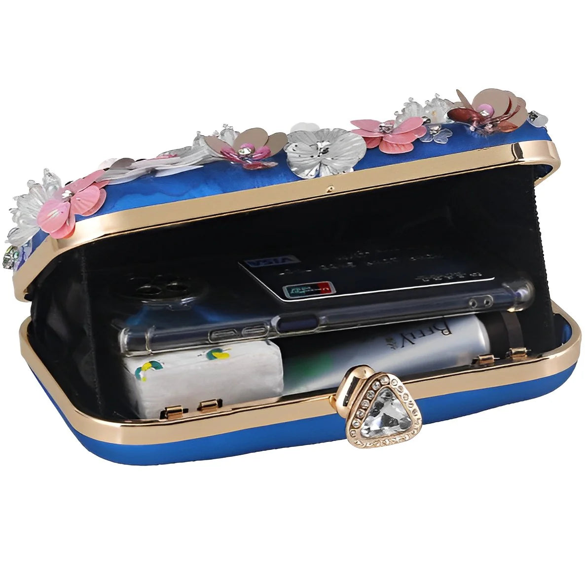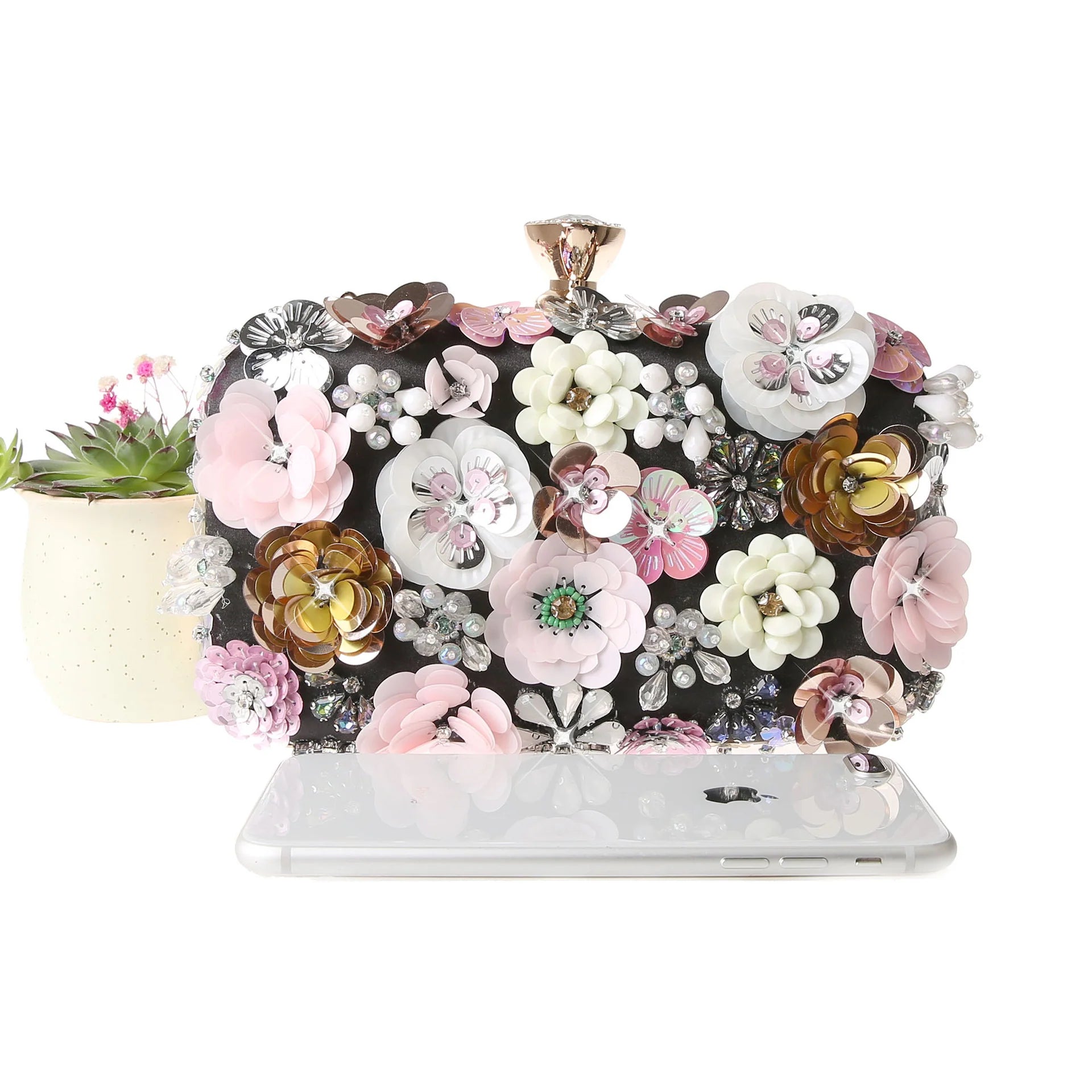 This feminine and beautiful bag is designed for a woman who wants to make a statement. This handcrafted clutch features a beautiful assortment of beads and flowers that give off a soft and subtle feel. It is sure to become a staple in your wardrobe. Now available in blue, black, and gold.